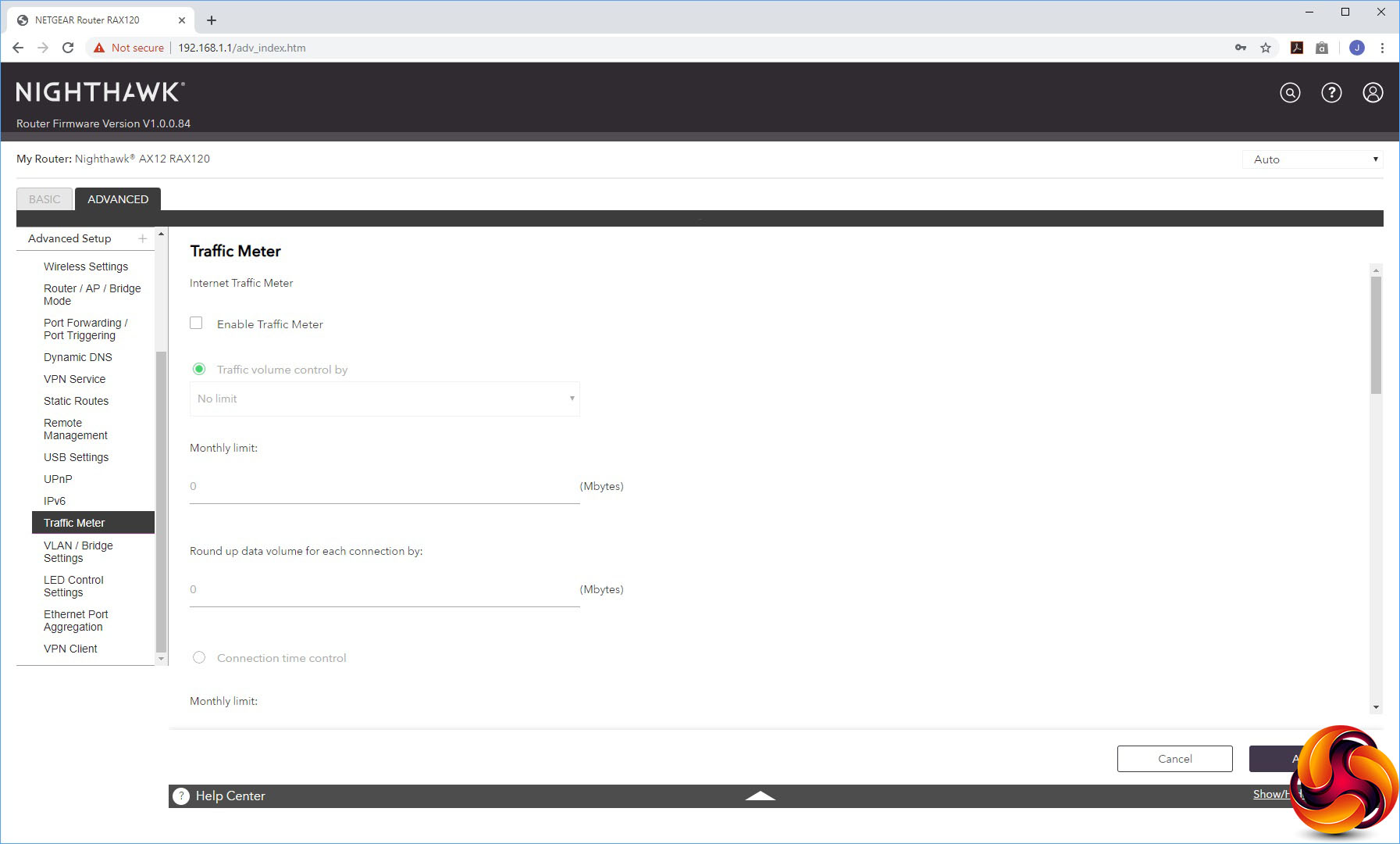 You can turn on dynamic DNS via NETGEAR's own service, No-IP or Dyn. The VPN section here allows you to make the AX12 into a VPN server instead of a client, using the OpenVPN system. You can set up static routes, enable remote management via the Internet, disable the USB ports, and configure both UPnP and IPv6. There's a Traffic Meter for imposing monthly data limits so you don't go over your broadband contract quantity.