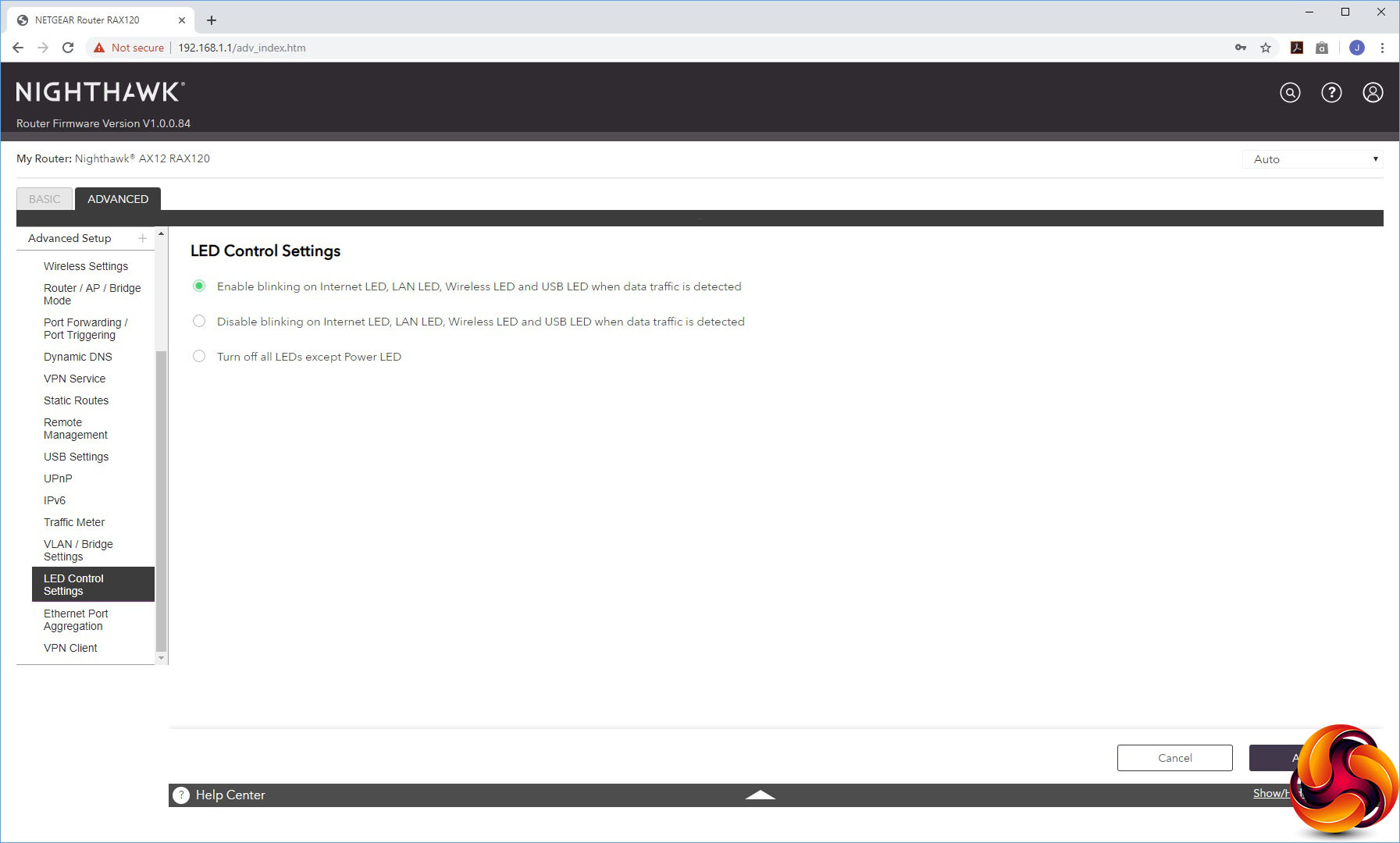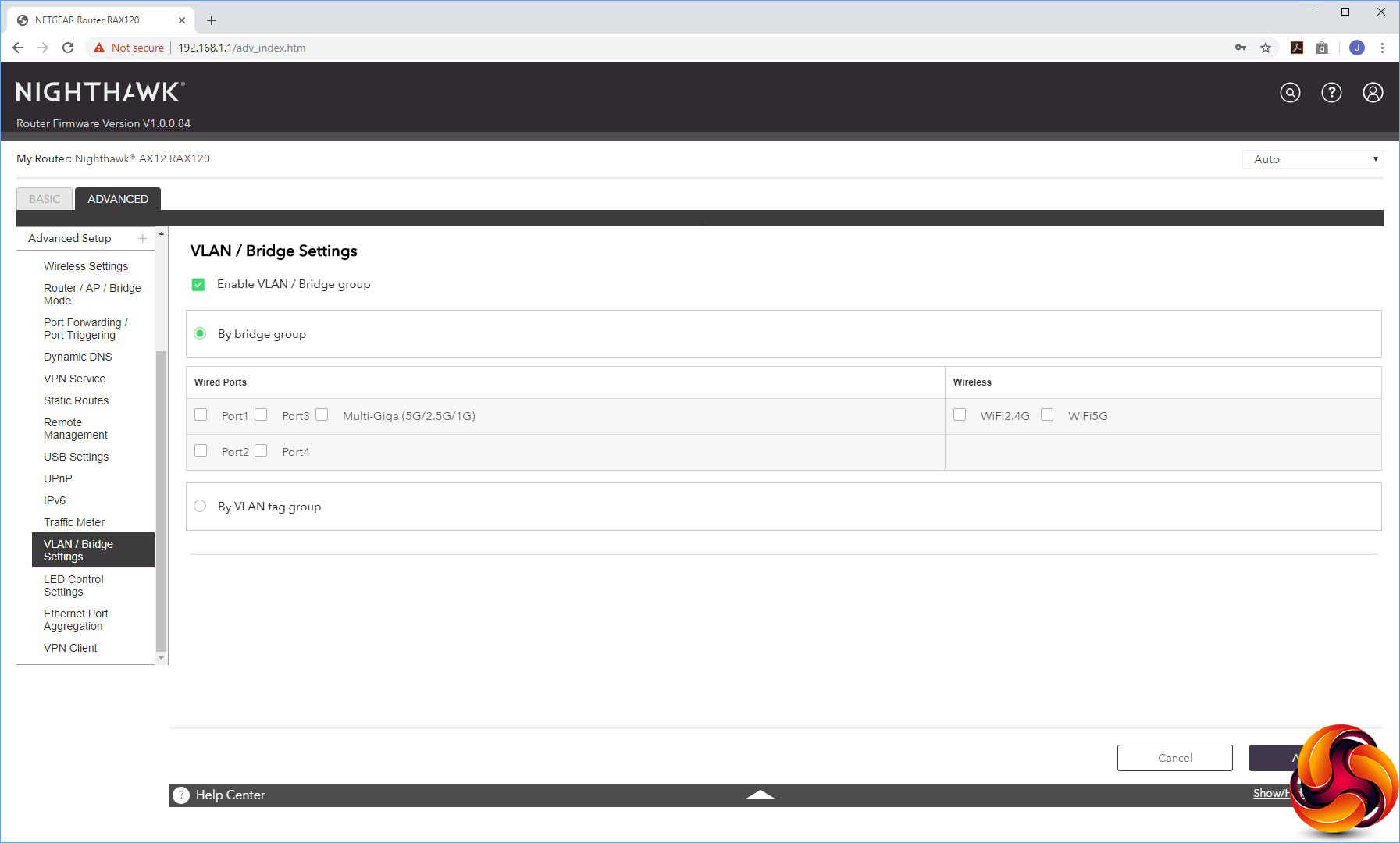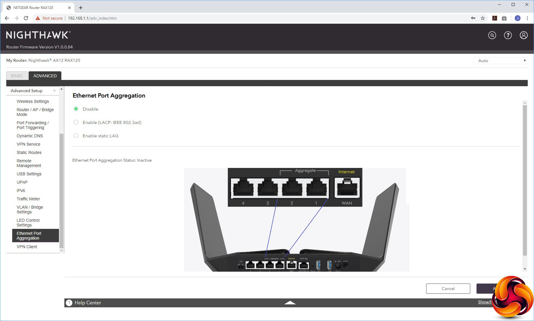 You can set up VLANs or a Bridge Group, and control which LEDs are lit. This is also the section where you can turn on port aggregation of the first two LAN ports, either via the LACP-IEEE 802.3ad protocol or a static LAG. Last on the list is another route to using the AX12 as a VPN client.