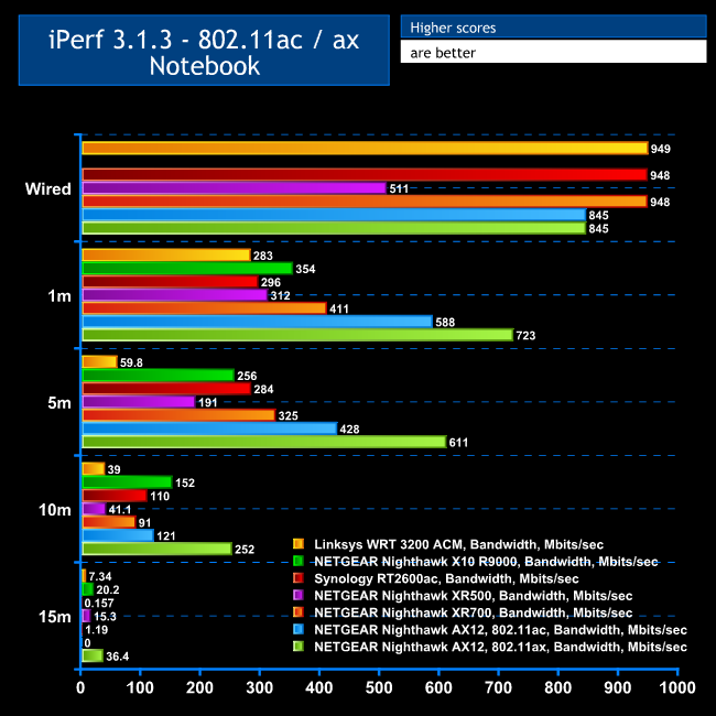 At 10m, the AX12's 802.11ac speed has settled down to be merely amongst the best at 121 Mbits/sec. But the 802.11ax speed of 252 Mbit/sec is still twice as fast as most 802.11ac options.