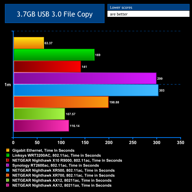 Strangely, performance here with 802.11ac was a few seconds faster than 802.11ax, but both were phenomenally quick. This shows the performance of the USB 3.0 port on the AX12 as well as its WiFi abilities. You're getting as close to Gigabit Ethernet wire speed over WiFi with this router as we have ever seen, whether using 802.11ac or 802.11ax.