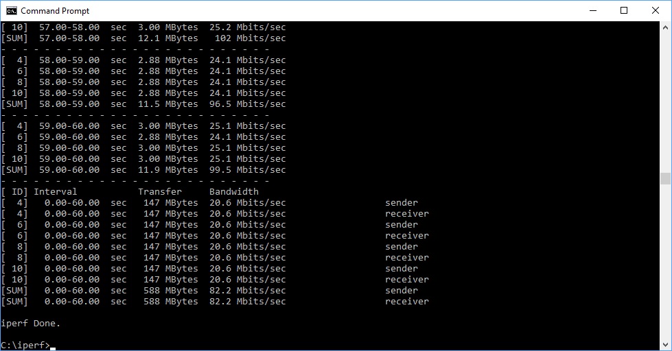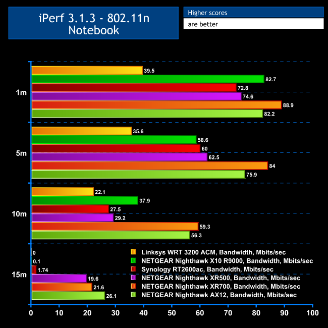 With each WiFi standard and distance, we took 60 readings of throughput at one second intervals and calculated the average (iPerf does this automatically). For these tests, we are also comparing the AX12’s performance with the NETGEAR Nighthawk XR700, NETGEAR Nighthawk XR500, Linksys WRT 3200 ACM, NETGEAR Nighthawk X10 R9000, and Synology RT2600ac.