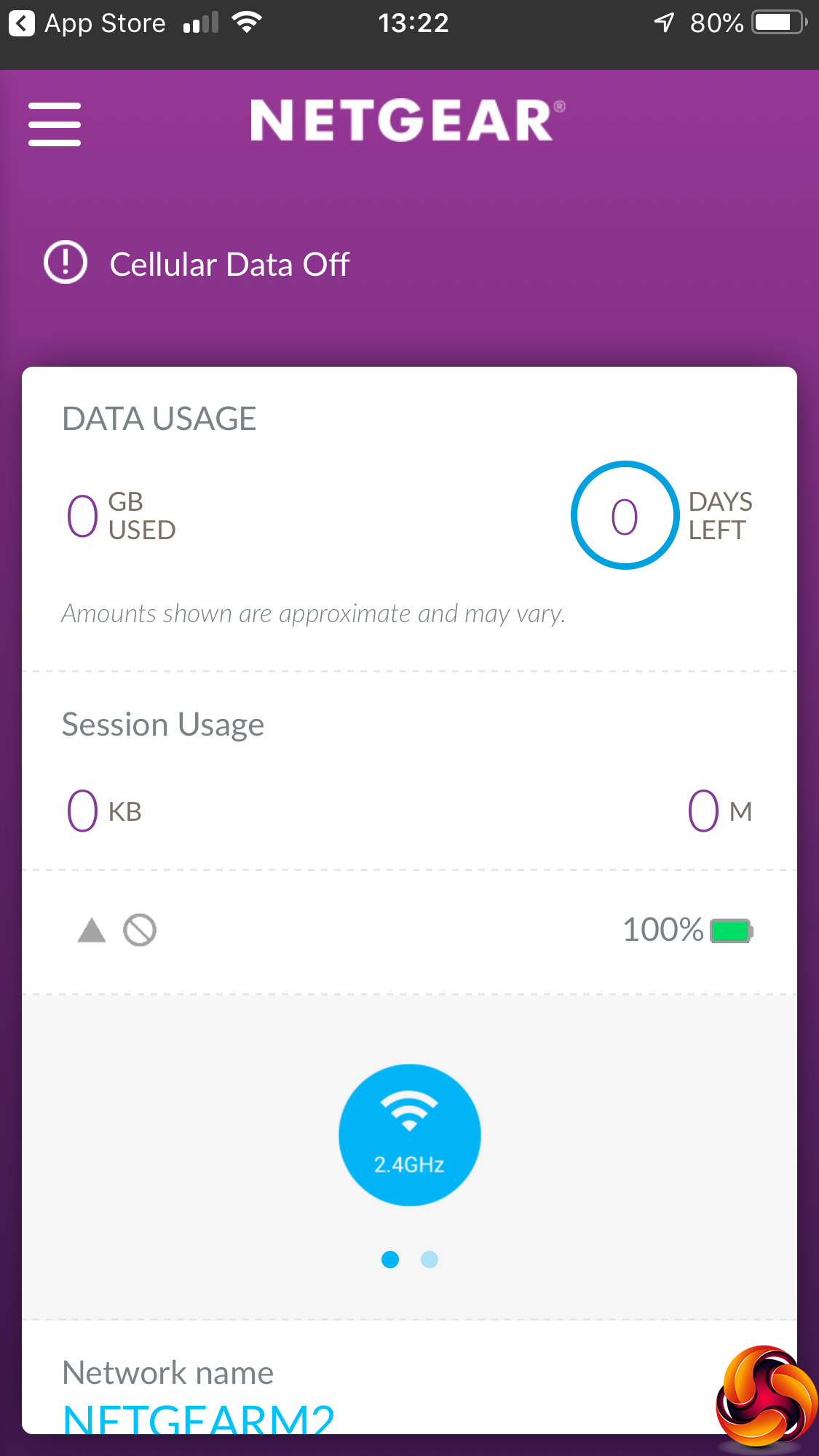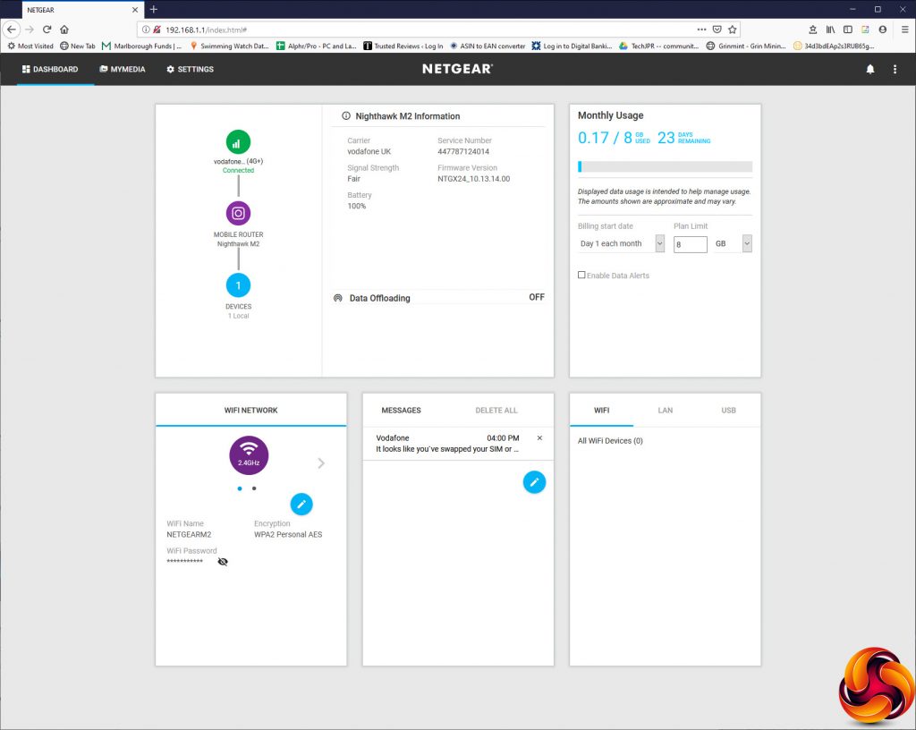The main Dashboard gives you a readout of current settings and status, such as connected devices, firmware status, and WiFi configuration. You can input your monthly data plan limit and see a readout of how much you have used within that.