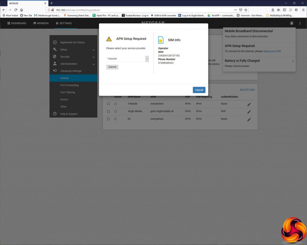 SIM setup looks like it should be pretty simple (and follows the same route if you use the LCD screen). You just confirm your SIM provider and Submit. Here we used an old T-Mobile SIM to get started, although our primary mobile data testing was performed with a Vodafone SIM instead. With the latter, we had to look up the APN settings and type those in manually to get onto the mobile data connection.