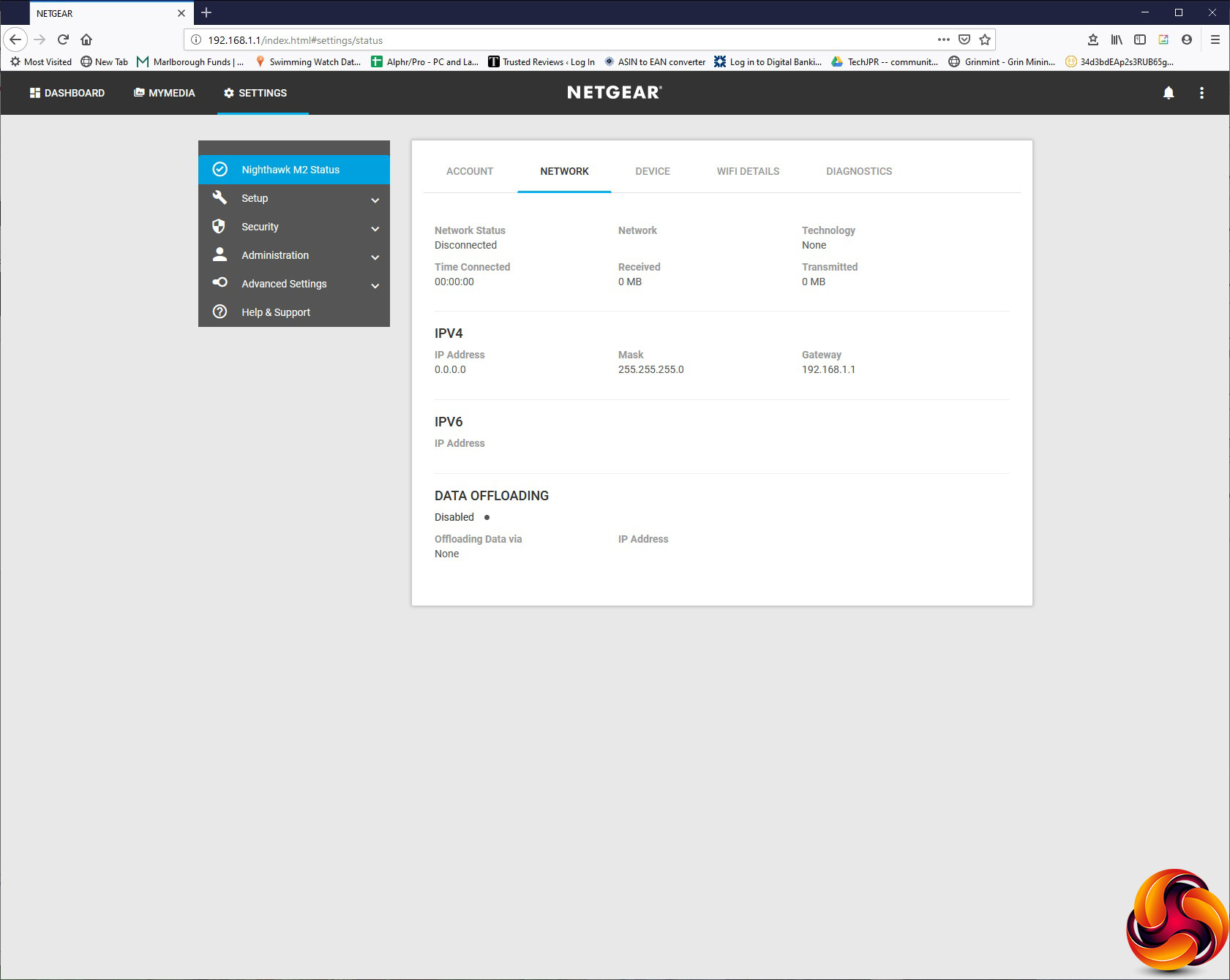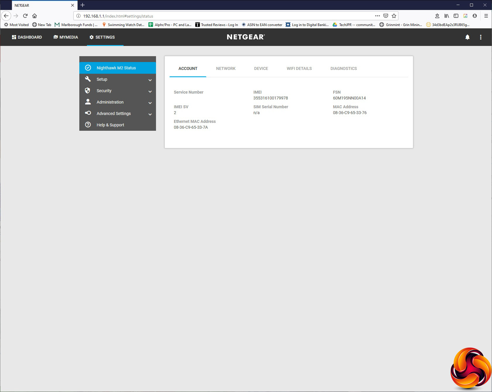 Under Settings, the Nighthawk M2 Status section gives you a subset of five more tabs. The first Account tab merely tells you the current SIM status and MAC addresses of the various adapters. The Network tab is also mostly informational, but adds the option to enable Data Offloading. This allows you to switch data traffic to a WiFi or LAN client to reduce the reliance on your mobile data connection – essentially load balancing with a bias away from mobile data.