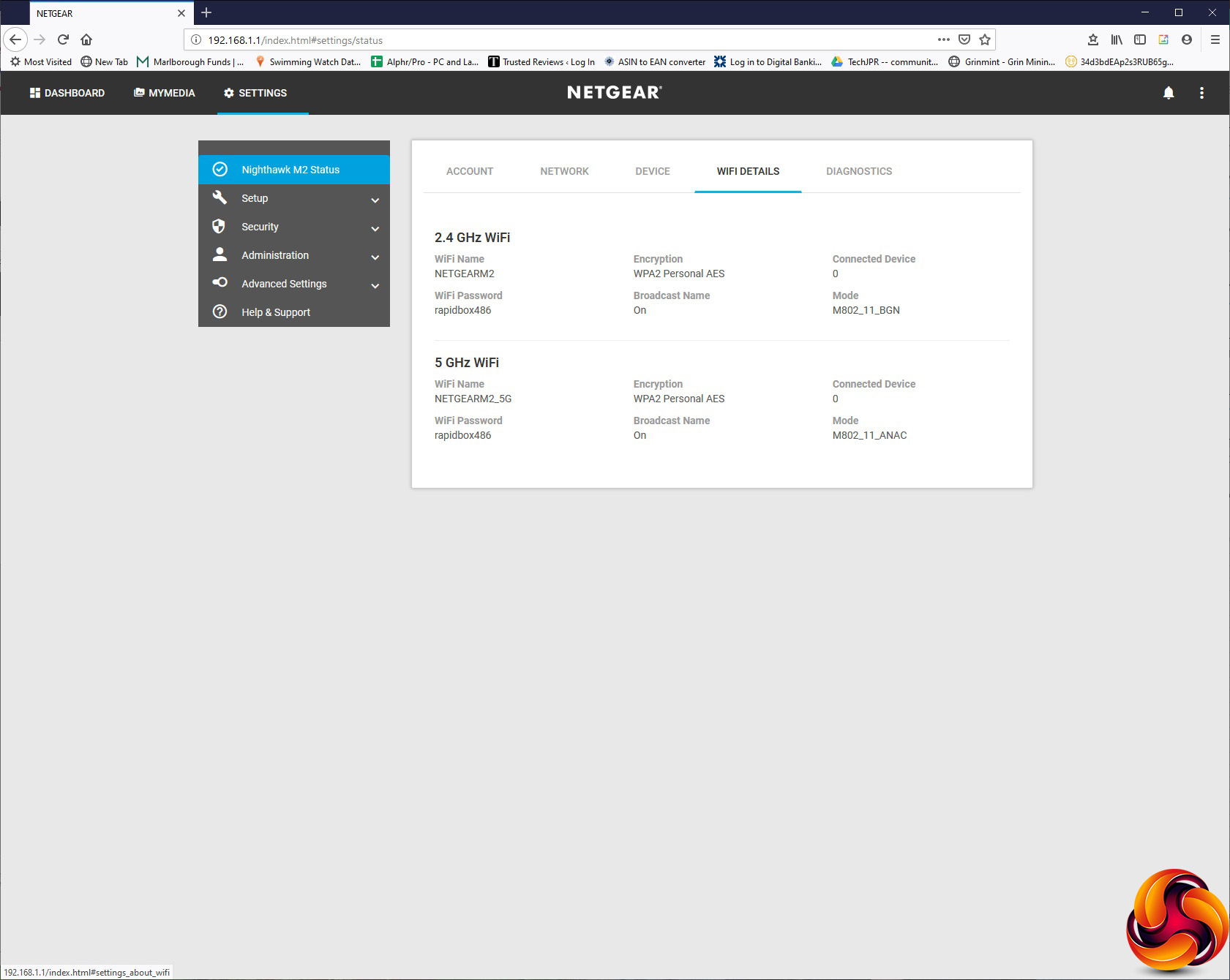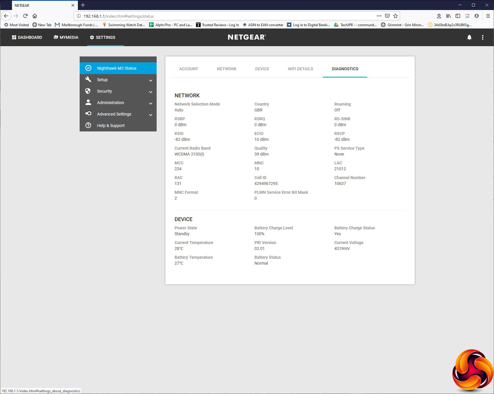 The Device section is informational, giving you details about the firmware, GUI and hardware versions. WiFi Details tells you about the wireless network, and Diagnostics provides a plethora of data about signal quality, channel usage, battery charge and even battery temperature.
