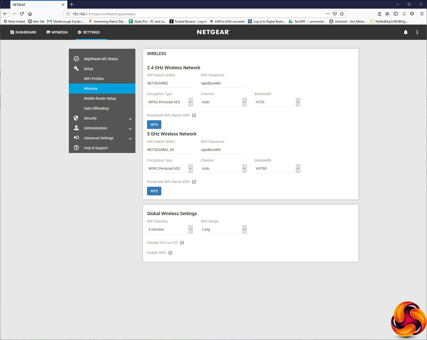 If you head to the Wireless section, you can change the SSID and passwords for the two frequencies, security setup and channel bandwidth configuration. You can also alter global settings for standby timeout and range across both radios.