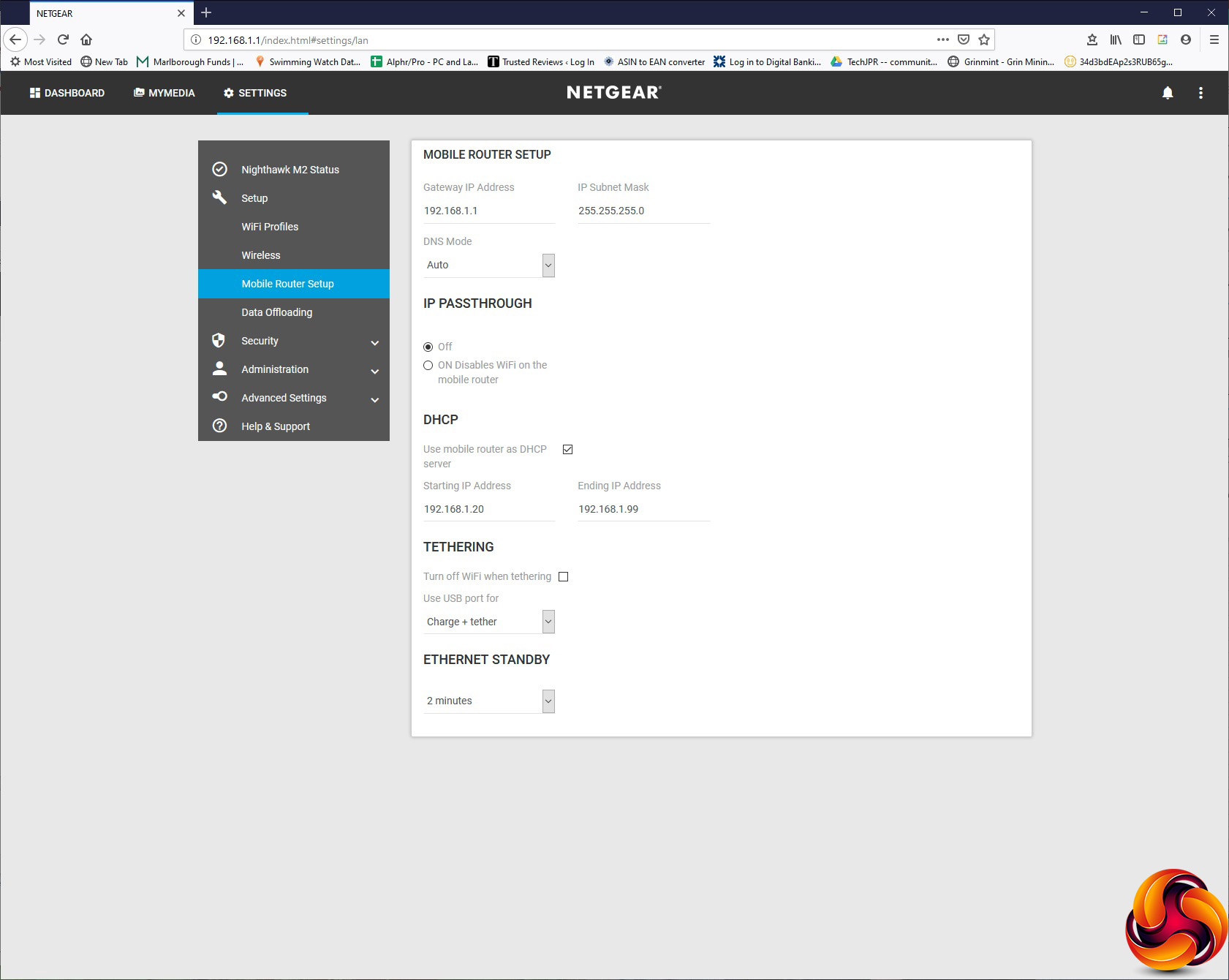 Under Mobile Router Setup, you can change the router IP and DNS mode, the DHCP range, and whether the USB port just charges or also provides data tethering. You can configure a backup WiFi or Ethernet connection under Data Offloading.
