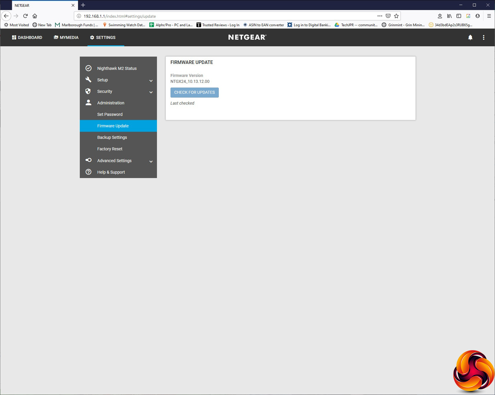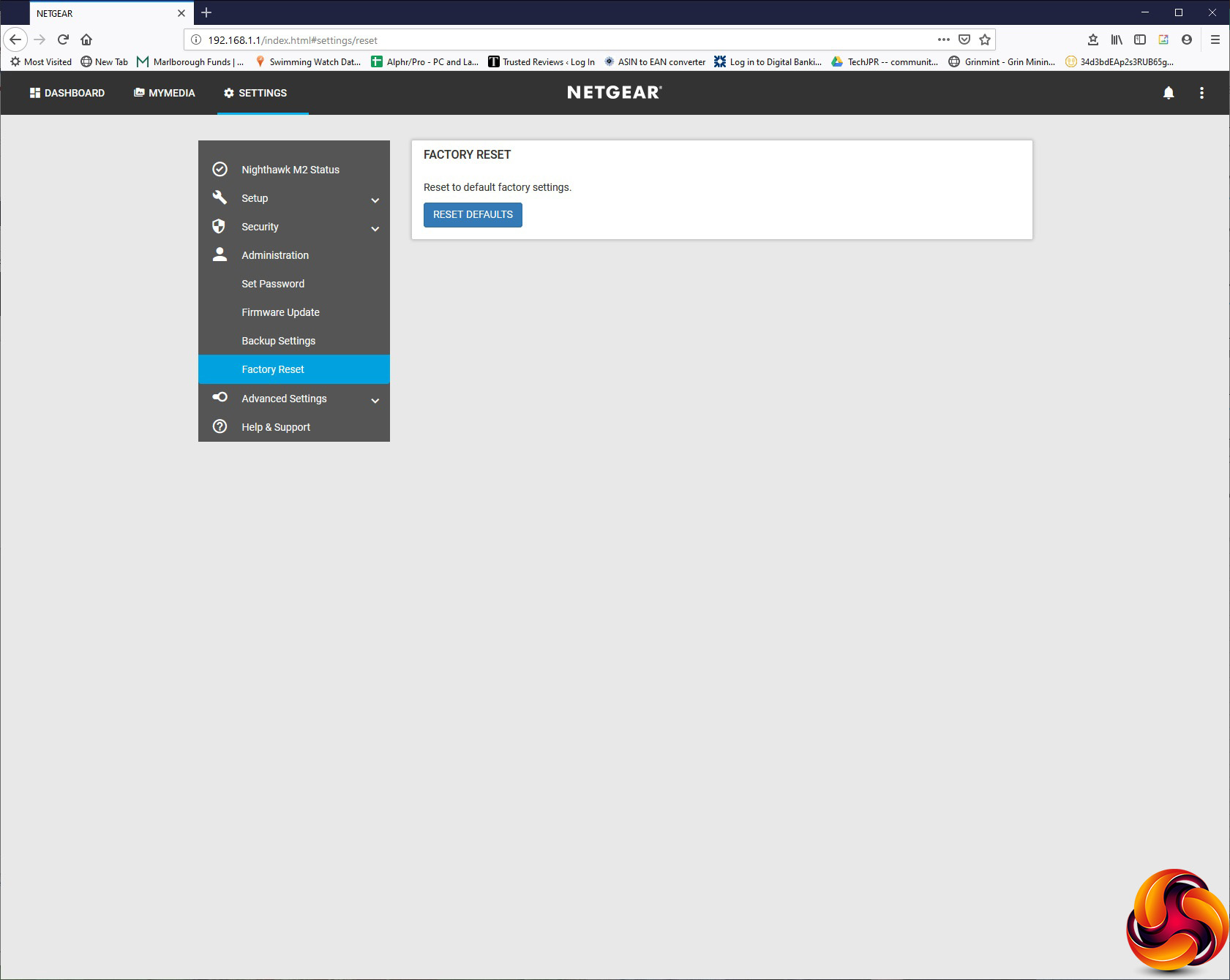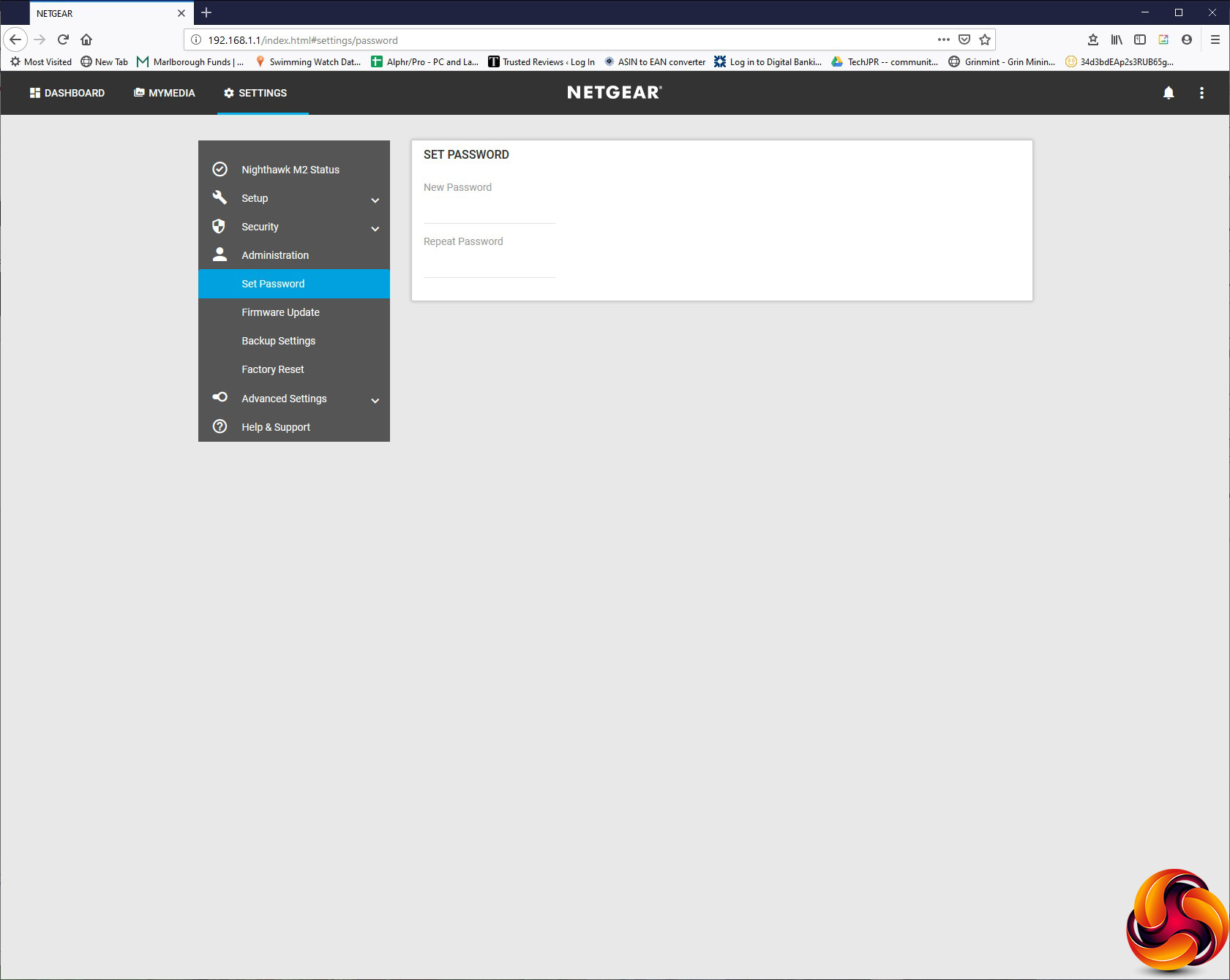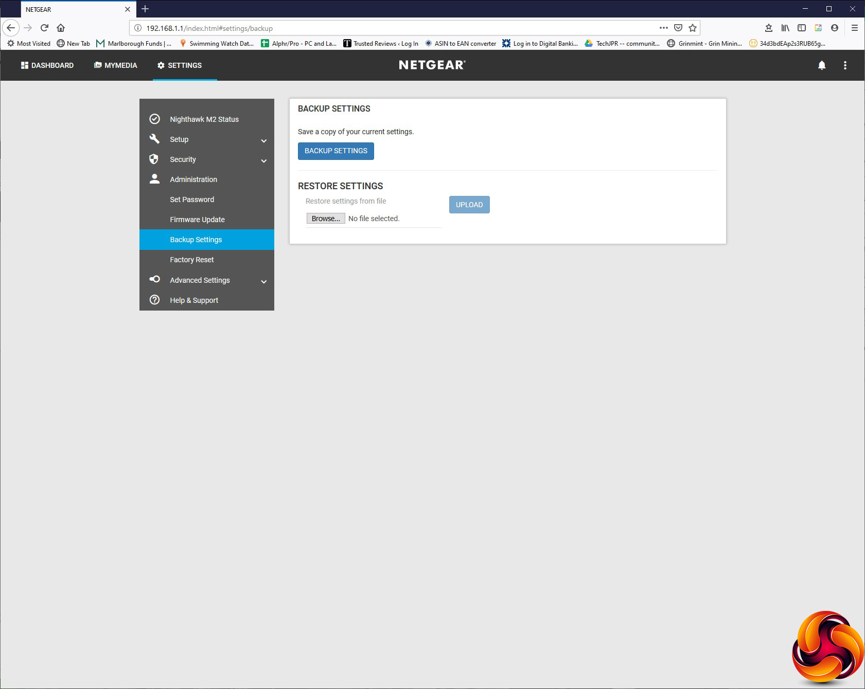 The Administration section has the usual options of changing the admin login password, updating firmware, backing up or restoring settings, and returning to factory defaults.