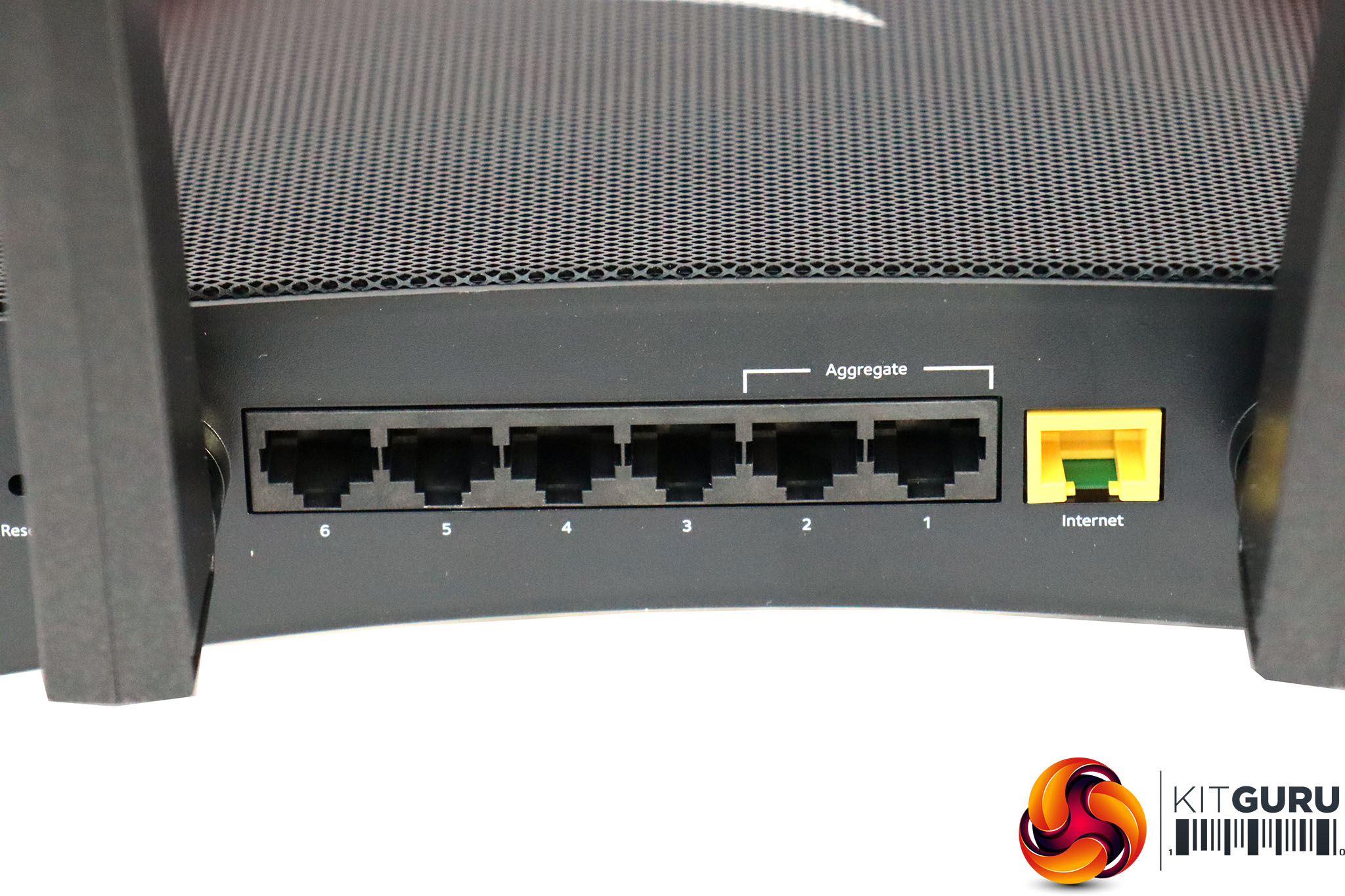 In the middle is the Gigabit Ethernet switch. There are six regular Gigabit ports plus an extra one that is dedicated for WAN broadband connections. The two ports next to the yellow WAN connection can be aggregated for faster throughput to another switch or NAS box. NETGEAR's own SX10 gaming switch and some of its ReadyNAS range offer port aggregation that could take advantage of this.