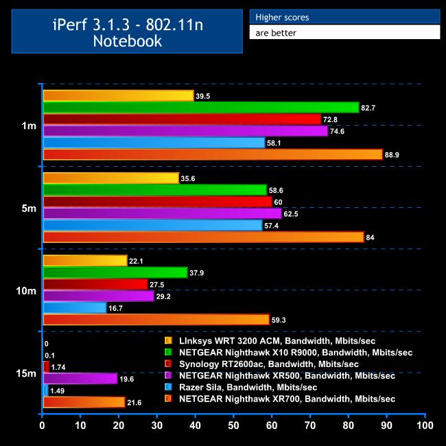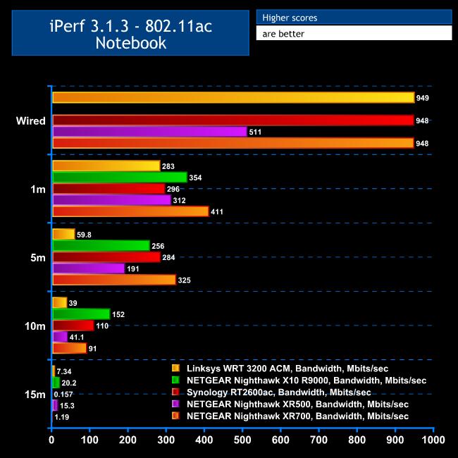At 1m, the 802.11ac performance is phenomenal. The Nighthawk X10 R9000 is fast, but the XR700 is even faster, providing 411Mbits/sec. At 5m, the speed doesn't drop that much, achieving 325Mbits/sec. However, beyond this performance drops off.