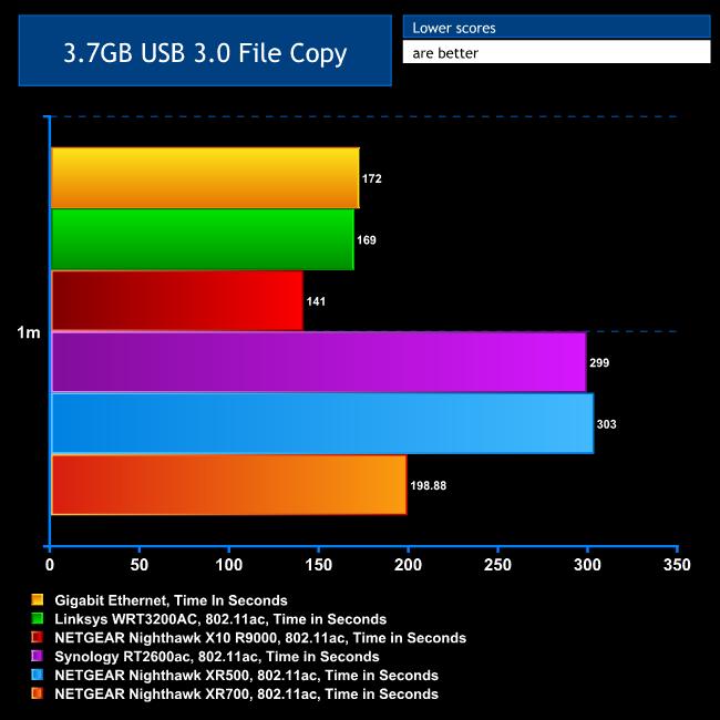 The time taken wasn't as fast as wired Ethernet, or the Nighthawk X10 R9000, but we were seeing speeds of up to 25MB/sec, making the XR700 a very viable option for attaching storage to for media serving or NAS activities.