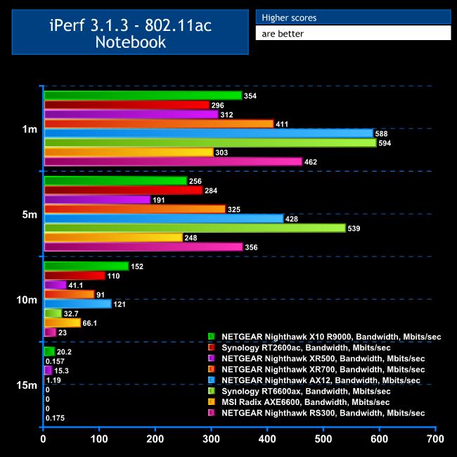 The RS300 is a bit more average with 802.11ac / WiFi 5, however. In close proximity, it managed 462Mbits/sec, which the NETGEAR Nighthawk AX12 and Synology RT6600ax cruise past.