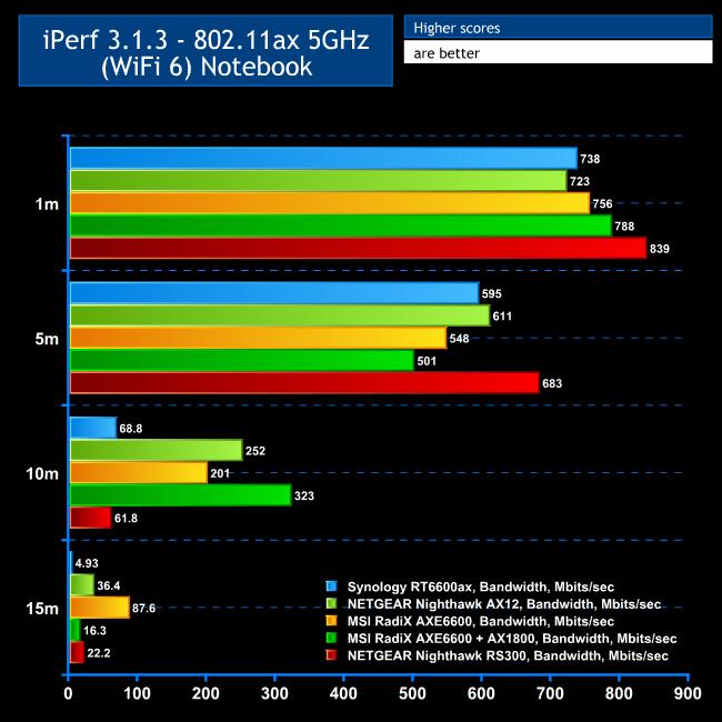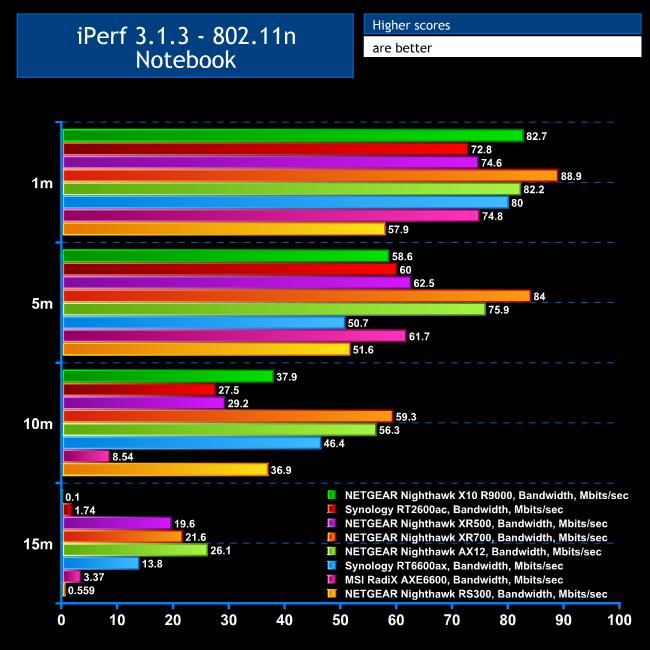 With each WiFi standard and distance, we took 60 readings of throughput at one second intervals and calculated the average (iPerf does this automatically). We tested the RS300 against the MSI Radix AXE6600, NETGEAR Nighthawk X10 R9000, Synology RT2600ac, NETGEAR Nighthawk XR500, NETGEAR Nighthawk XR700, Synology RT6600ax, and NETGEAR Nighthawk AX12.