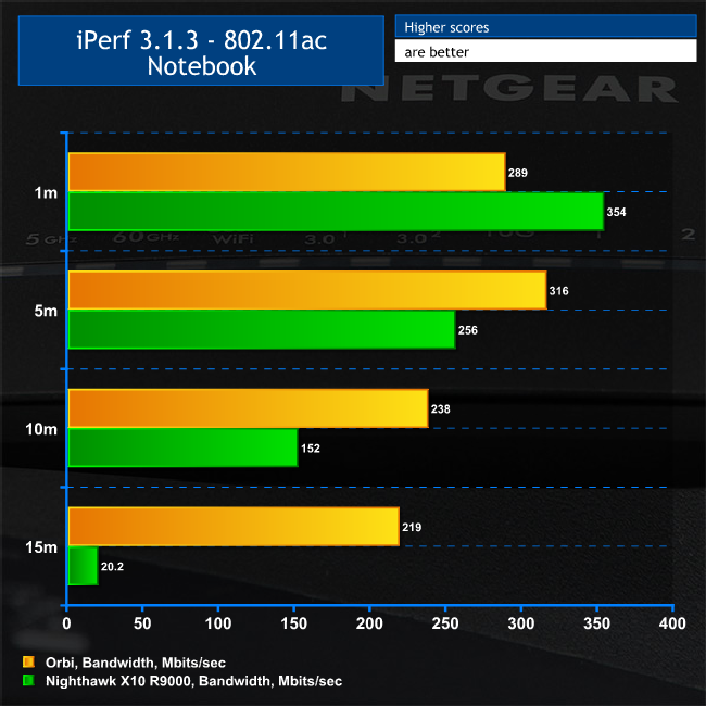 With each WiFi standard and distance, we took 60 readings of throughput at one second intervals and calculated the average (iPerf does this automatically). For selected tests, we are also comparing the R9000’s performance with the NETGEAR Orbi. Note that for the wireless tests the Orbi’s satellite was at the same 10m distance as the notebook.