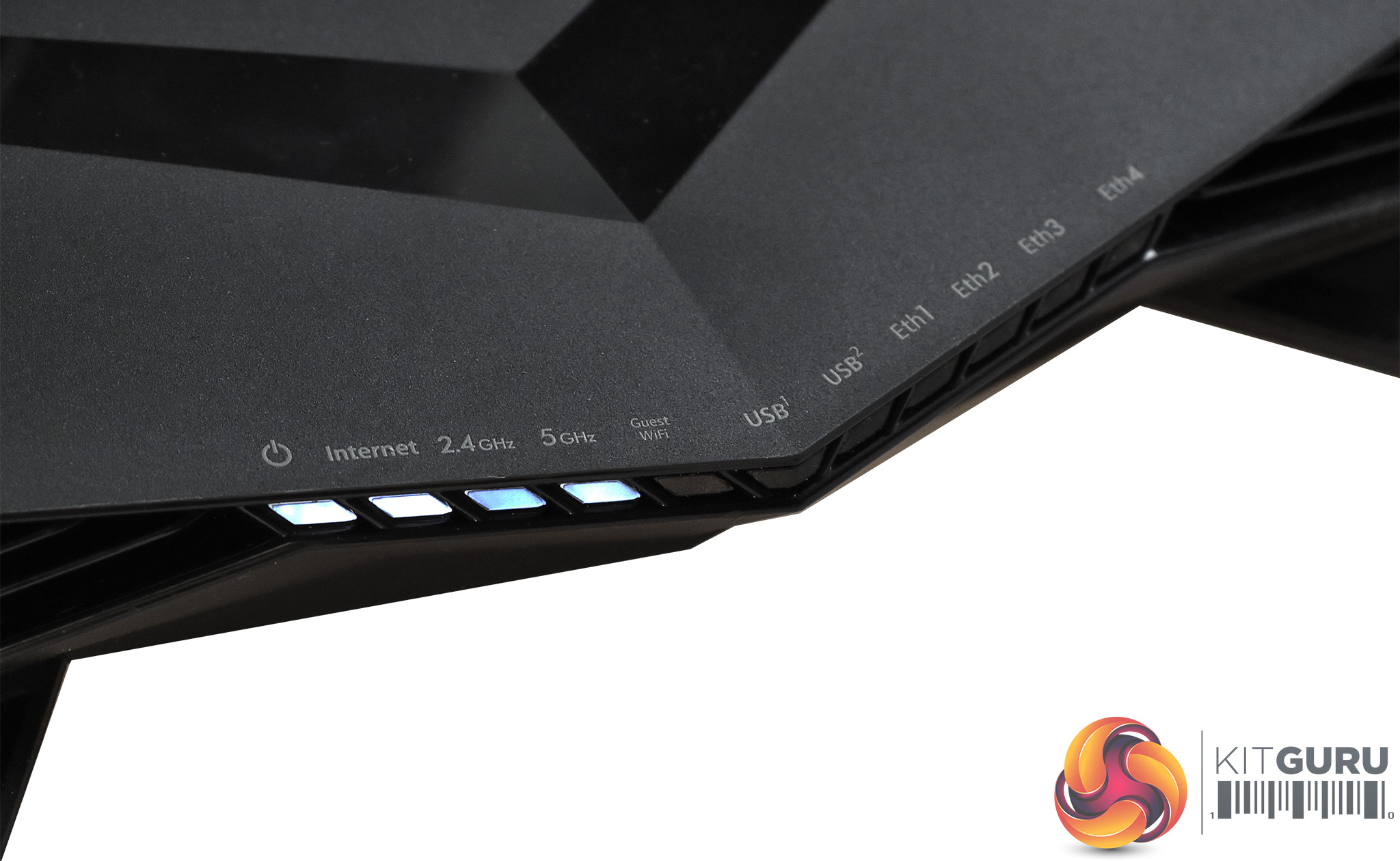 The port allocation is normal for a router in this class. There are four Gigabit Ethernet connections for general LAN devices, plus a fifth for your broadband connection. The only really novel feature here is the discrete switch for turning the front LEDs on and off, should you find them too distracting or if your router happens to be in your bedroom.
