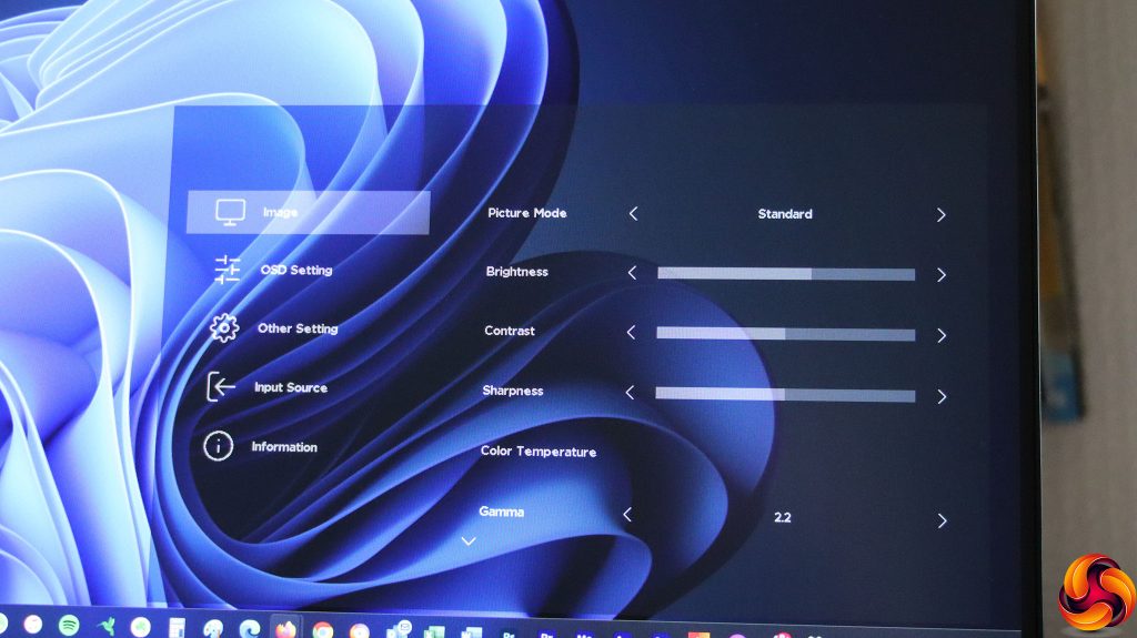 Push the joystick in and you get to the Main Menu, with the Image subsection open by default. This gives you combined access to the Picture Modes, Brightness, Contrast, and Sharpness. Color Temperature options include Cool, Normal, Warm and Custom, which lets you choose Red, Green and Blue values separately. Gamma levels include 2.0, 2.2 (the default), 2.4 and (strangely) Off. If you scroll further down, and you can alter Saturation, Response Time (Normal, Fast, Fastest), Refresh Rate display in the upper left or right corner, and turn MPRT on or off. The latter improves the perception of motion clarity when gaming. You can also vary the level of Low BlueLight and Black Equalizer, as well as force aspect ratio to 4:3 or 16:9.