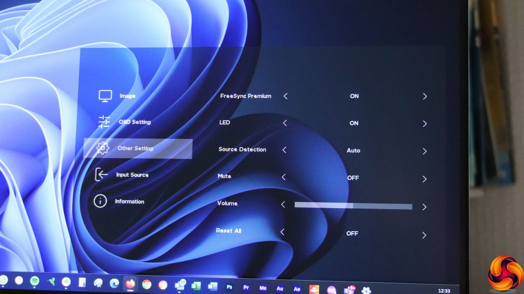 The Other Setting section lets you toggle the FreeSync Premium adaptive system, turn the LED on the front off or on, and control whether the video source is detected automatically or set manually. You can mute the audio and change the volume of attached headphones, as well as resetting everything to default.