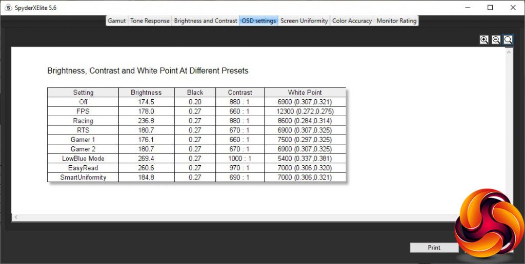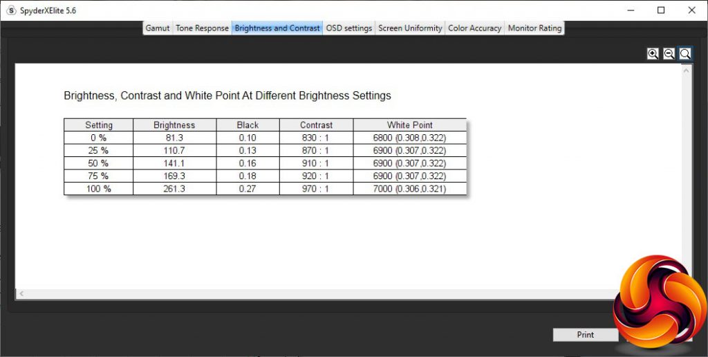 - A monitor’s contrast ratio at various brightness levels in the OSD.