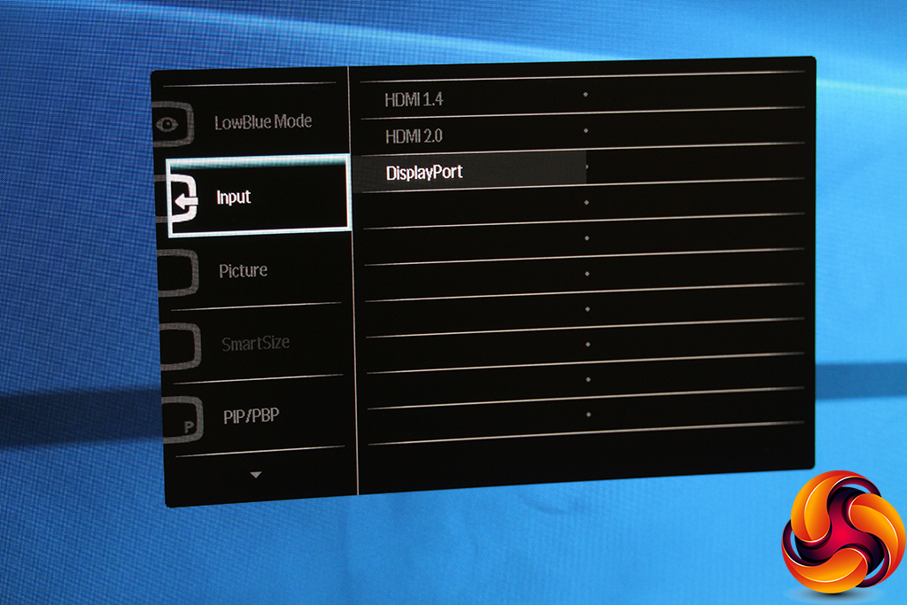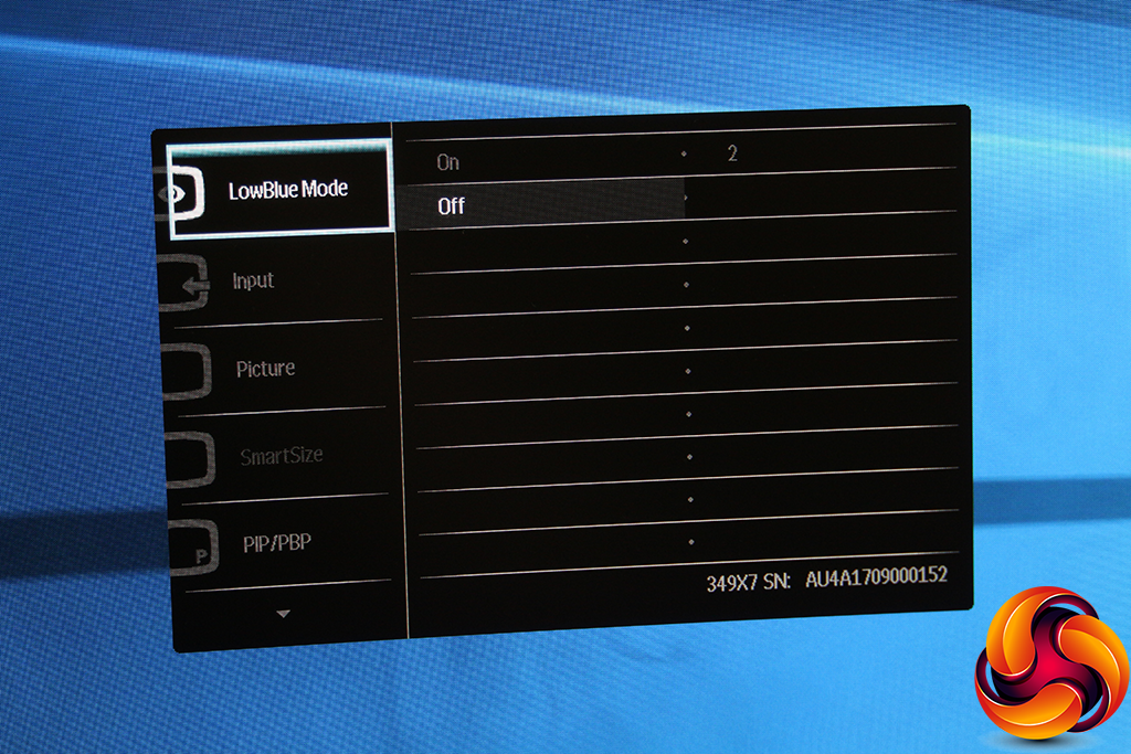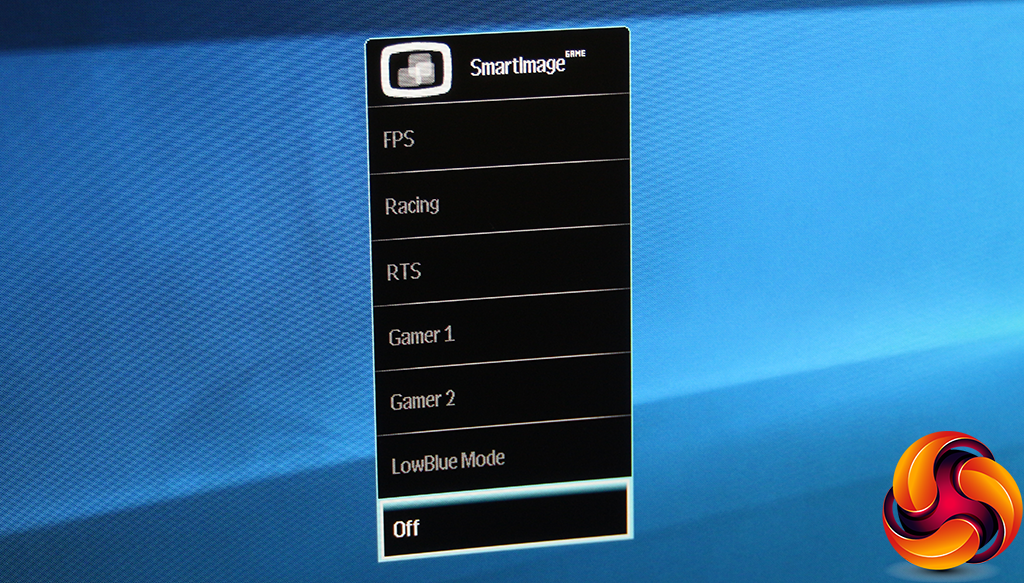 Push the joystick left and the SmartImage presets appear. Although this isn't specifically a gaming monitor, the presets appear to be gaming focused, with FPS, Racing and RTS options, two user-configurable settings, and an eye-saving LowBlue Mode.