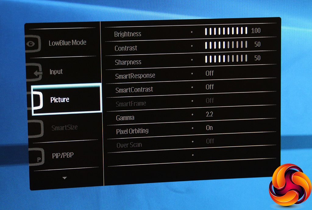 The Picture section in the main menu is one where you may find yourself regularly. It contains options for adjusting brightness, contrast and sharpness, plus SmartResponse, an overdrive system that reduces ghosting on fast-moving images due to the relatively slow pixel response of a VA panel. SmartContrast is a dynamic contrast mode that adjusts the backlight to give a greater perceived contrast between darker and lighter areas.