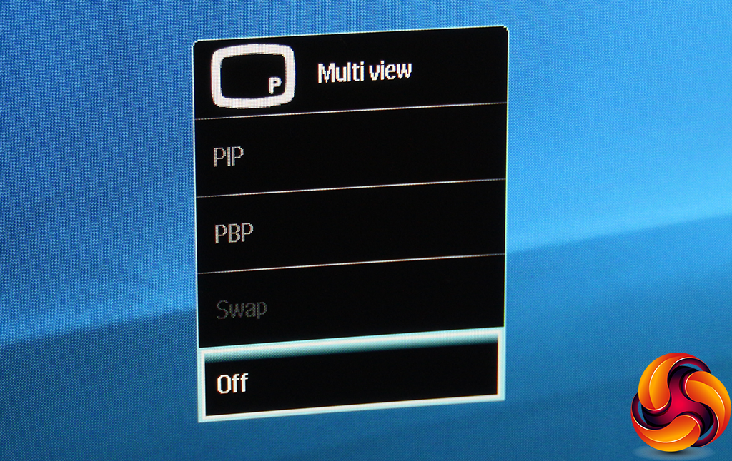 Press the joystick up and you can view multiple inputs at once, either as picture in picture or side by side. With a 21:9 aspect monitor and a native resolution of 3,440 x 1,440, this might actually be useful.