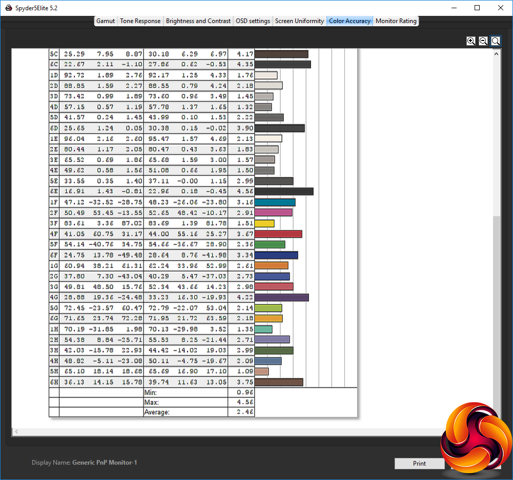 The uncalibrated colour accuracy of 2.46 is decent, but not outstanding. We have seen better out of the box, so it definitely seemed worth trying to improve things with the Spyder's calibration system.