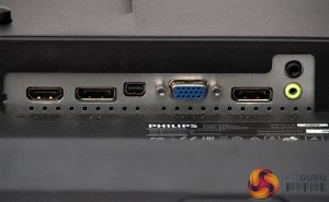 Then there's a full-sized DisplayPort 1.2, followed by a Mini DisplayPort 1.2, and finally VGA for legacy inputs. The second full-sized DisplayPort is actually an output, so you can daisychain your screens for a more convenient multi-display setup. Last along the row, two minijack ports are available for analog audio in and out.