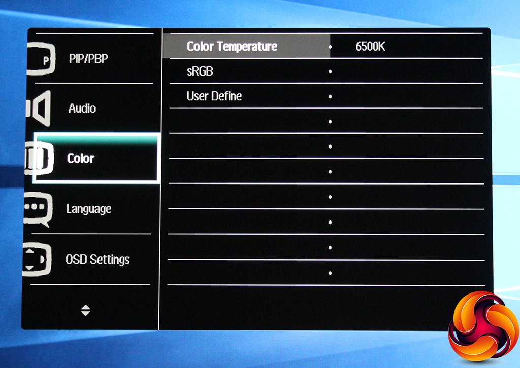 The Color menu lets you choose between a variety of temperature presets, including 5000K, 6500K, 7500K, 8200K, 9300K, and 11500K. Alternatively, there's an sRGB mode, or you can use User Define to adjust red, green and blue individually.