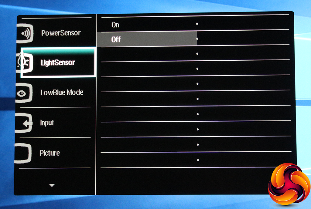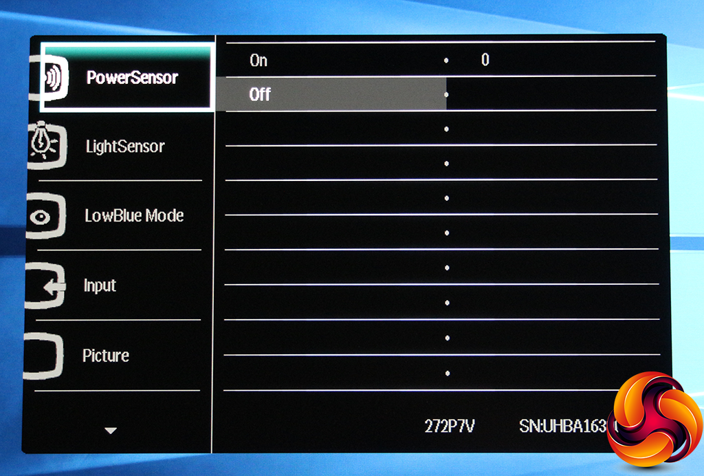 The fourth button from the left calls up the main menu, which contains a lot of submenus. The default, strangely, is PowerSensor. This is a clever technology that detects whether you are in front of the screen or not and dims the screen automatically when you're not there. When it detects your return, it will turn the screen back onto full brightness again. This has four different settings, and has potentially significant power consumption savings.