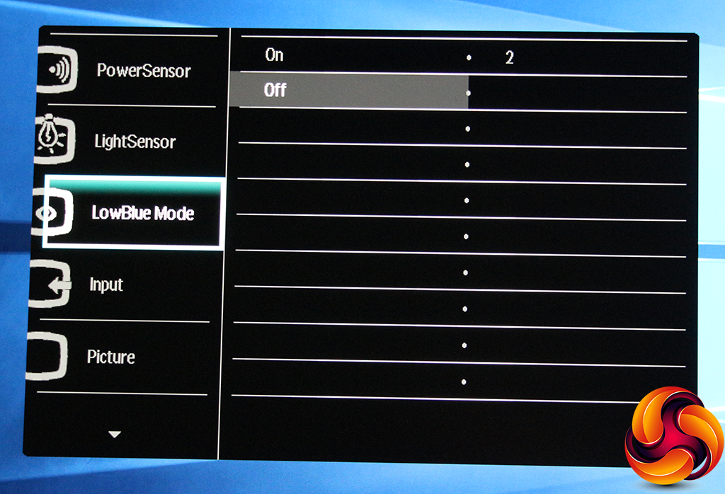 The now-familiar LowBlue Mode is next on the menu list, offering three levels. This is designed to reduce the blueness of the screen to reduce eye strain.