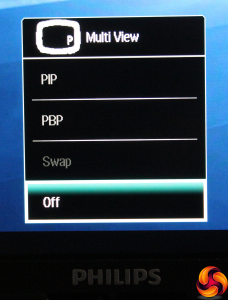 The next button calls up the Multi View menu, where you can choose to have the signal from multiple inputs onscreen at the same time. Options include picture-in-picture, picture-by-picture, and swapping between the two. The latter switches which input is which with the other two options.