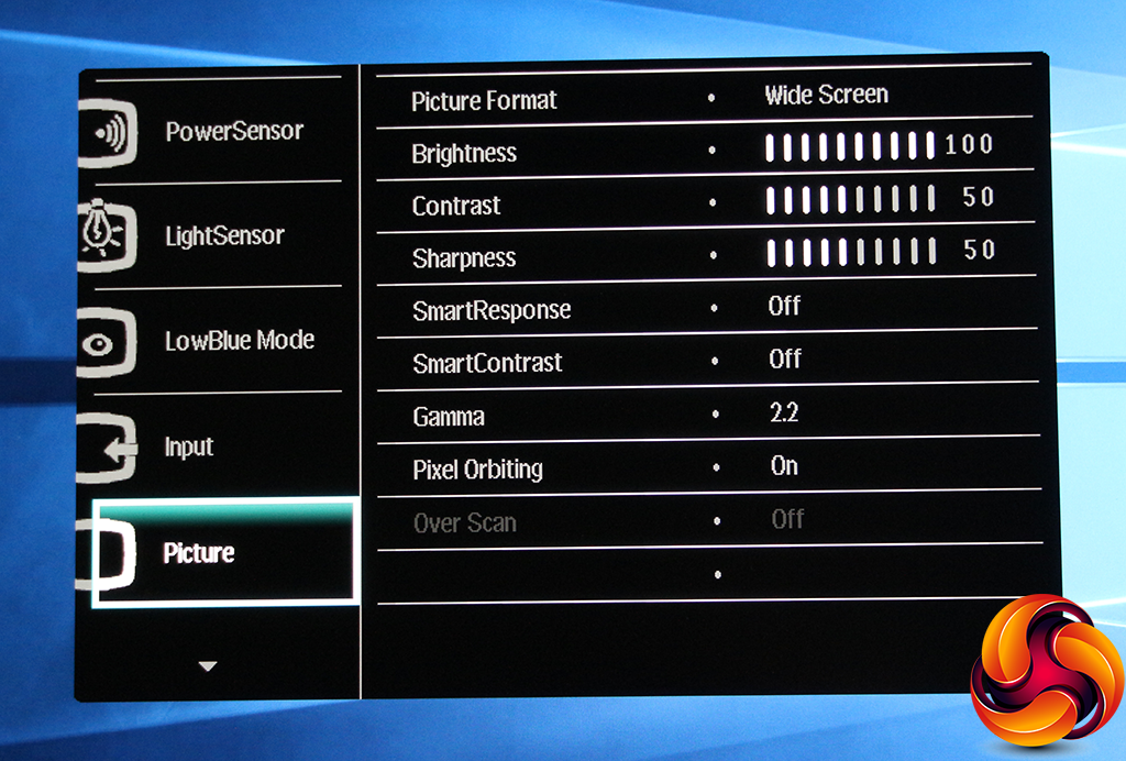 The Gamma mode has five settings – 1.8, 2.0, 2.2, 2.4 and 2.6 – with 2.2 being the default. Pixel Orbiting is a system to avoid burn-in from static images. The Over Scan option is only available with analog signals from the VGA input, and will enlarge the picture to cut off the edges of the picture which might be a black border.