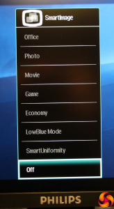 The first button from the left calls up the SmartImage presets, which must be what the cryptic icon refers to, although this doesn't match the one used by the OSD. The presets include Office, Photo, Movie, Game, Economy, LowBlue Mode, and SmartUniformity, so they cover a comprehensive range of normal activities you might use your screen for, from work to entertainment.