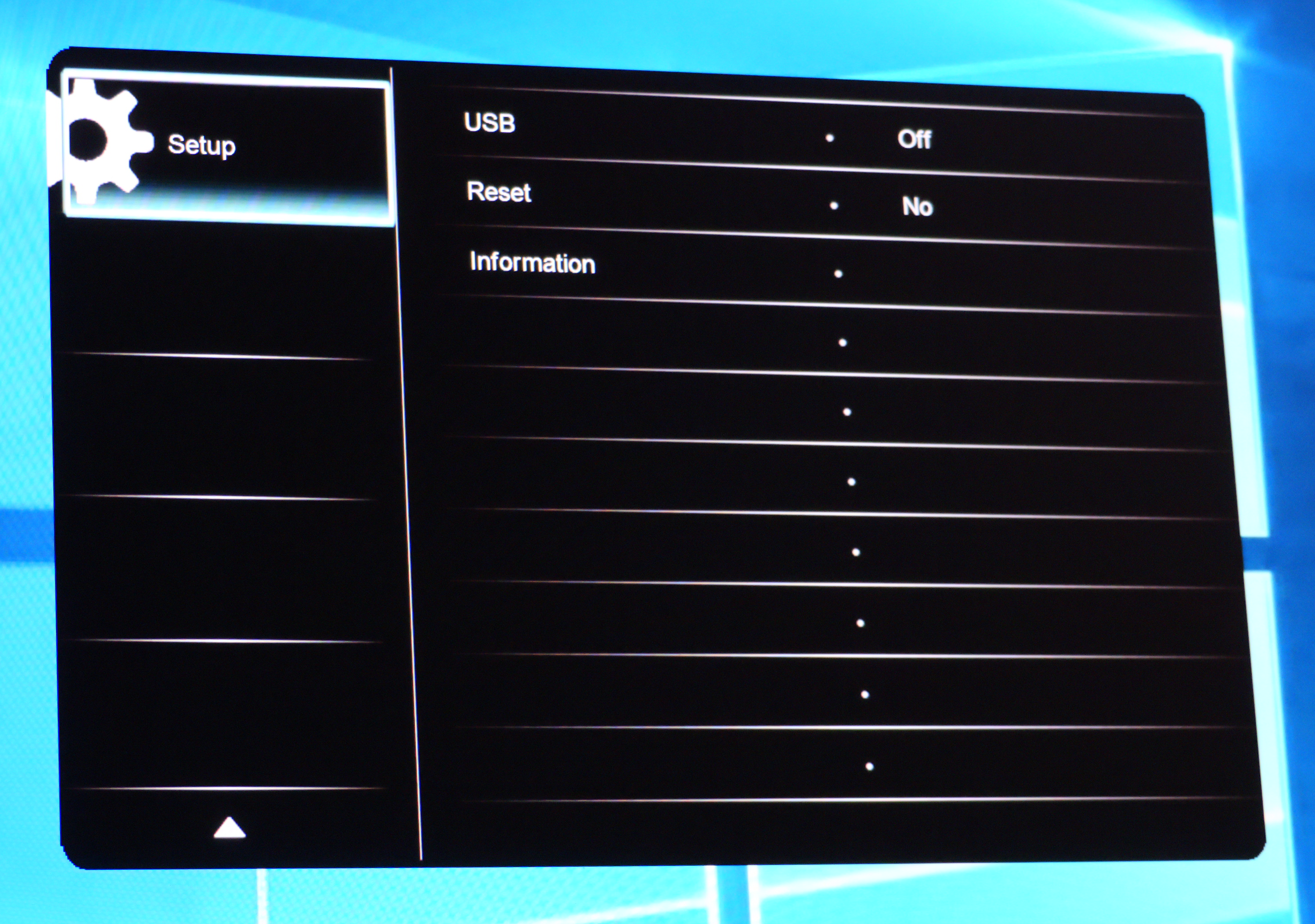 Not much going on in Setup either. You can choose to turn the USB hub off and on, reset everything to default, and call up screen information.