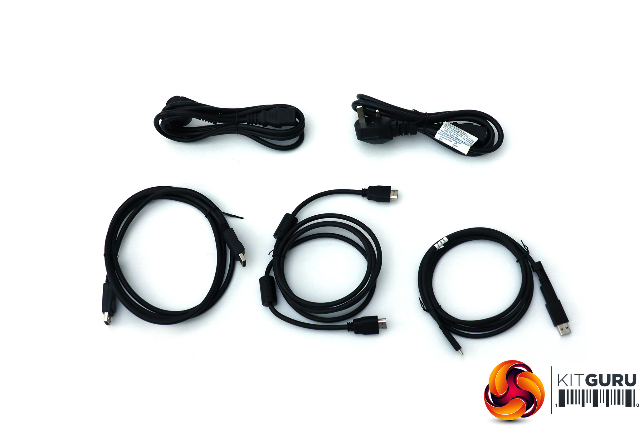 Inside, along with a choice of power cables, you get HDMI and DisplayPort wires plus USB C to Type A. Strangely, no USB-C to USB-C was included with our sample, although this is supposed to be part of the bundle.