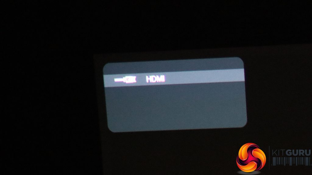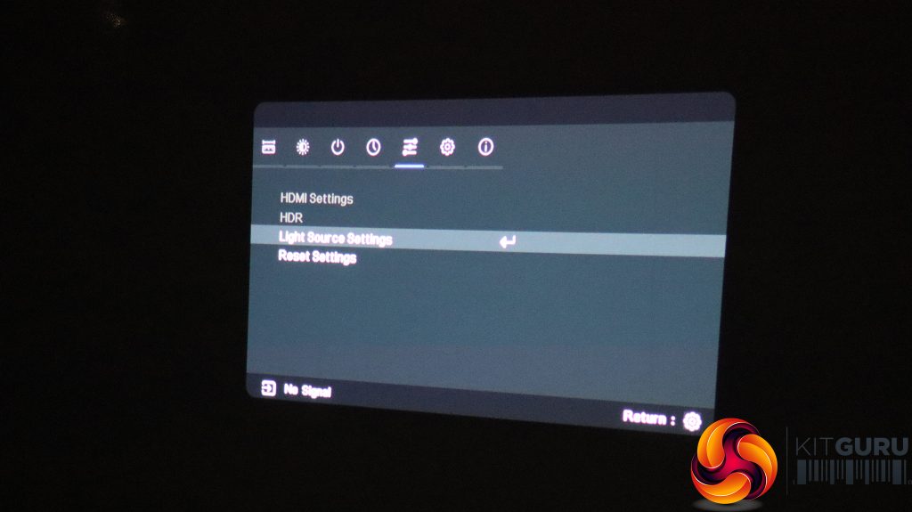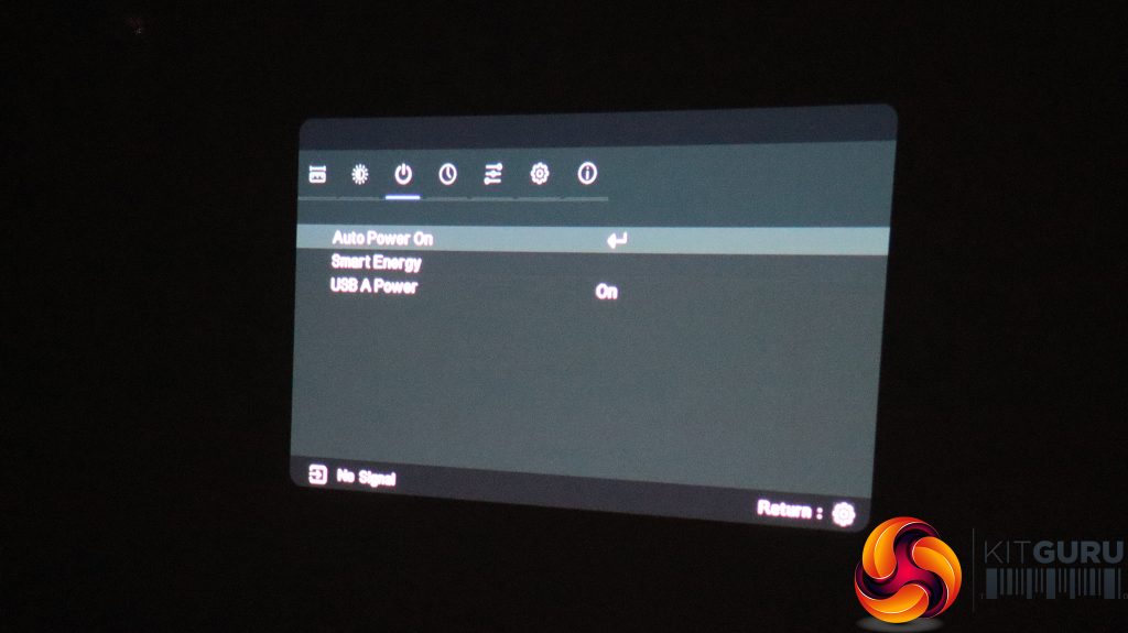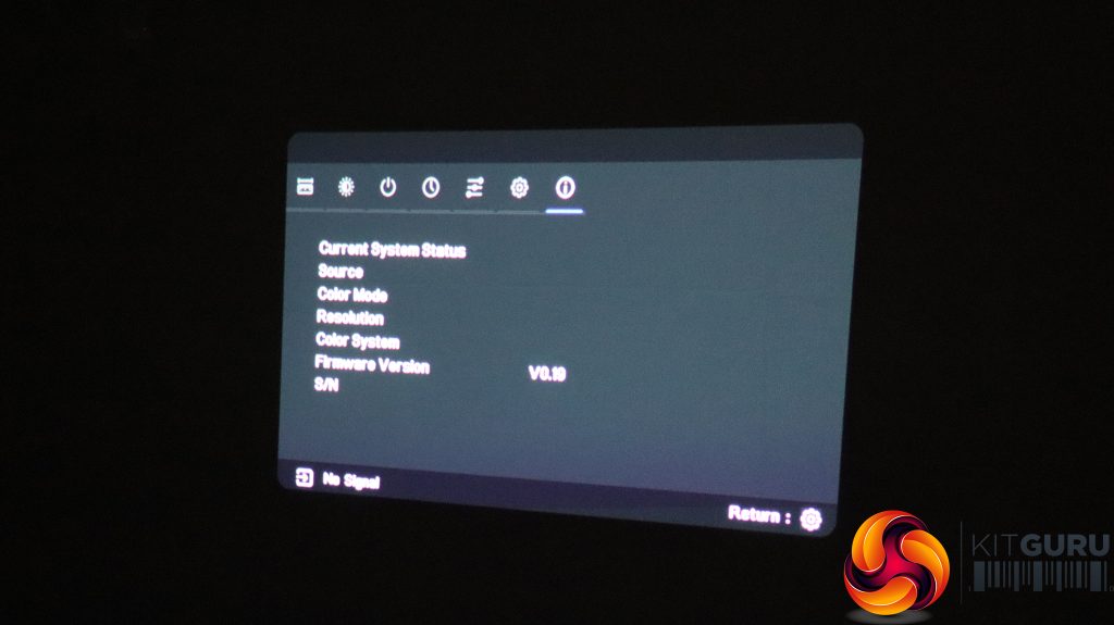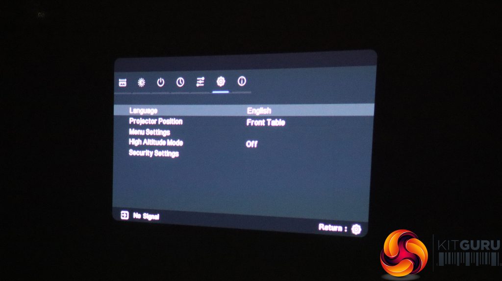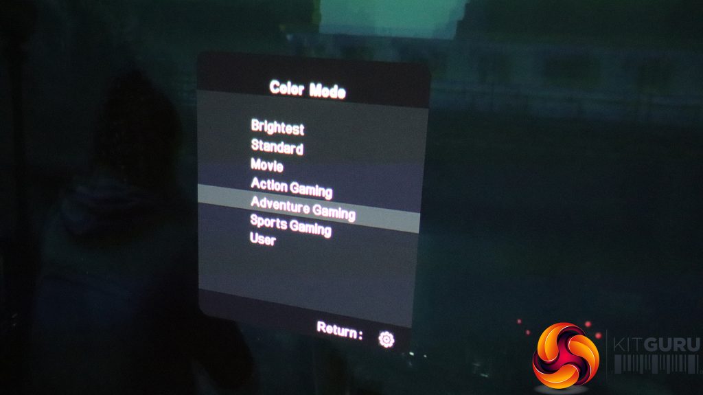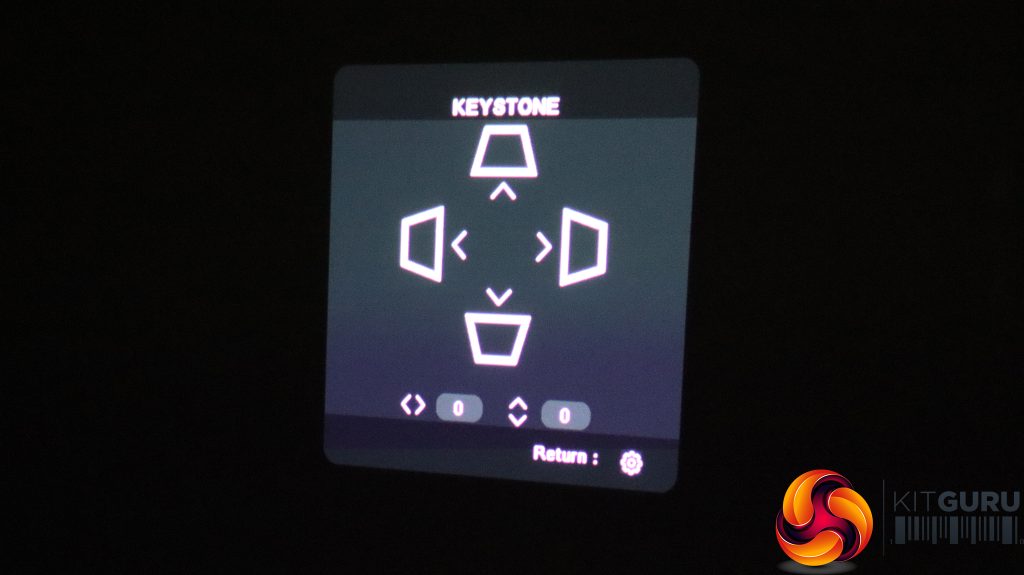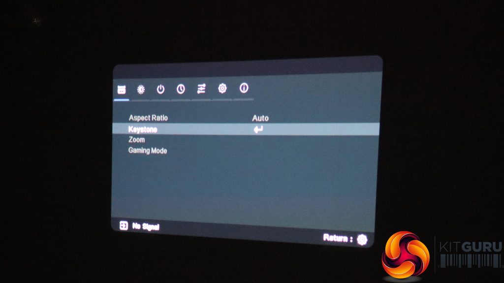 The little cog button on the remote calls up the menu, with the first tab providing the ability to change the aspect ratio, keystone (again), zoom, and gaming mode. This setting restarts the projector specifically for this application.
