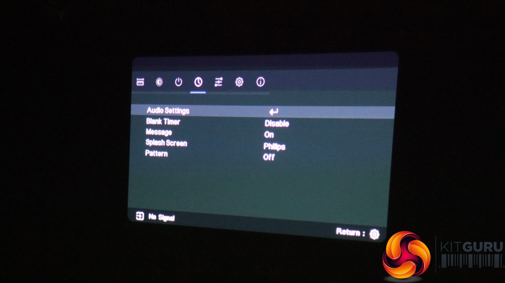 The fourth tab provides sundry startup and shutdown options, including a timer for the light to blank, the Philips splash screen and enabling a pattern (to aid adjustment).