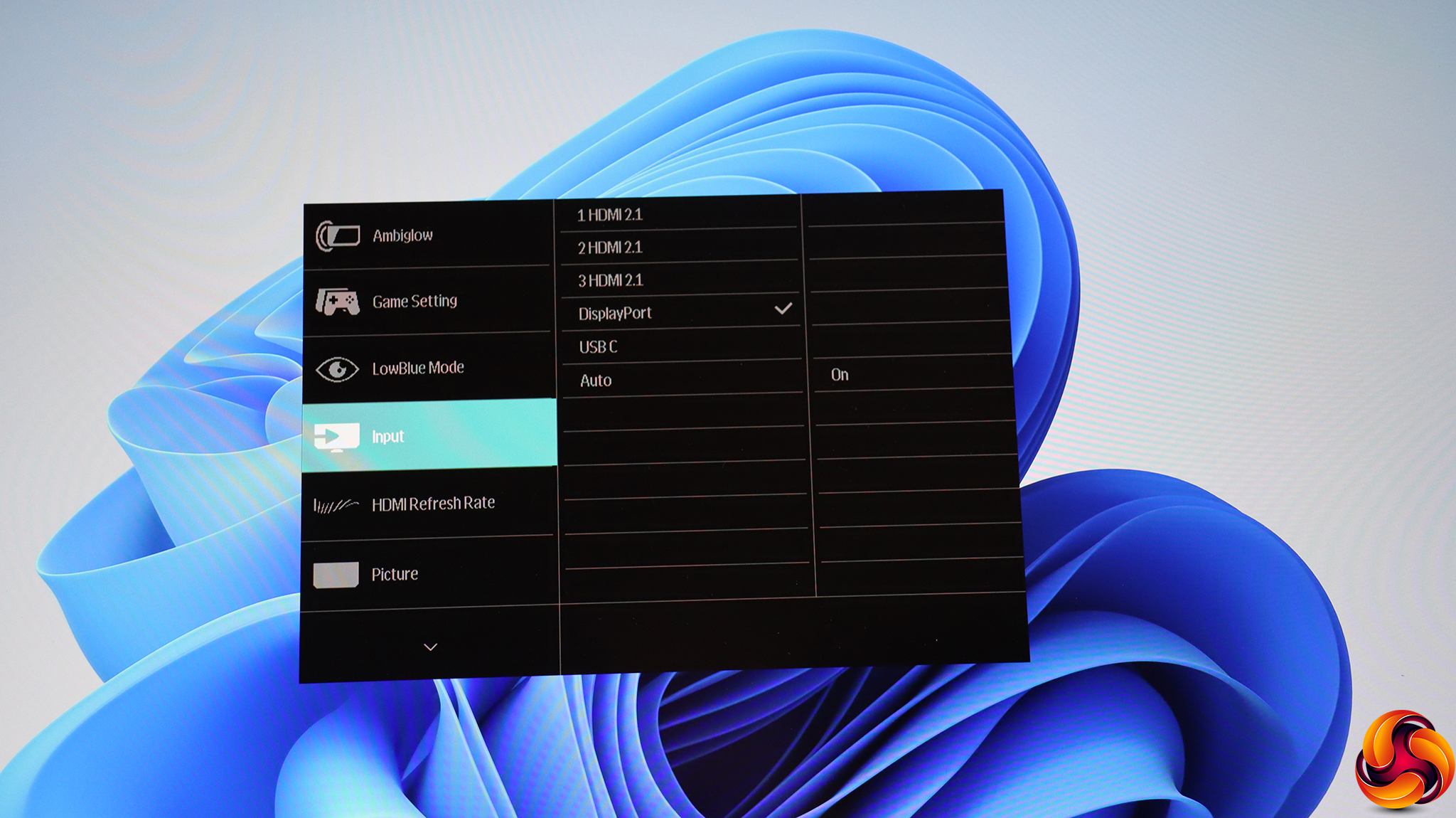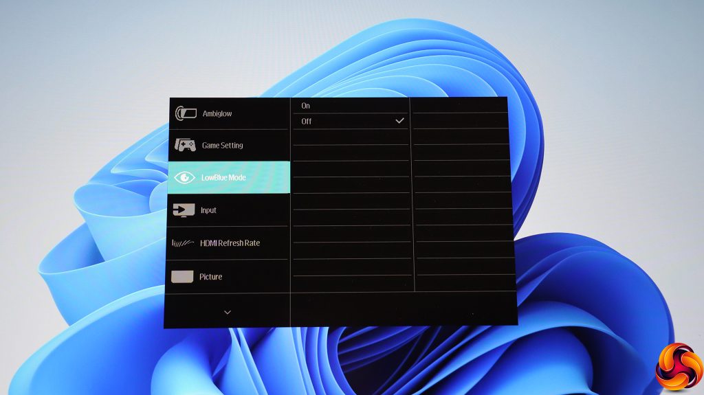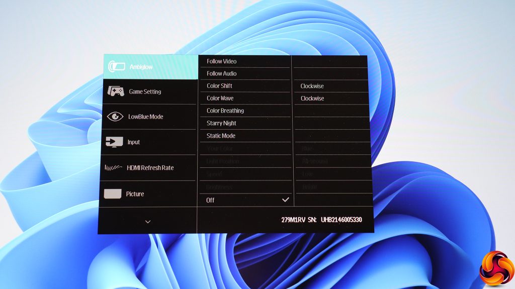 Pulling the joystick right calls up the main menu with the Ambiglow option highlighted. If you haven't experienced Ambiglow, this is Philips's technology for adding a bit of extra immersion to its screens via additional rear lighting. It's a development of Ambilight, which has provided this at a more modest level for some years, including for TVs. Ambiglow has plenty of options, including the ability to follow audio as well as video. If the screen itself is somewhat sober in appearance, Ambiglow adds a bit more pizzazz via dynamic lighting.