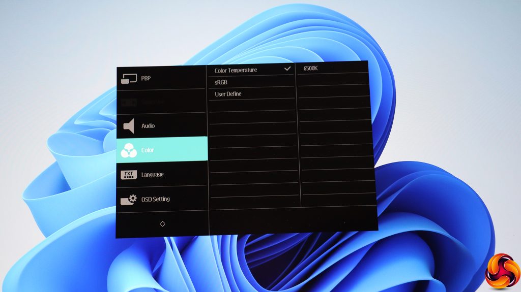 Color options including temperature presets of 5000K, 6500K (the default), 7500K, 8200K, 9300K, or 11500K. Alternatively, you can select sRGB mode or User Define to tweak the red, green and blue values separately.
