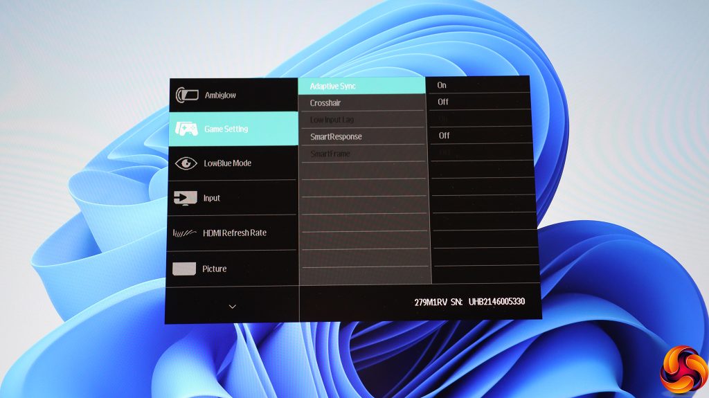 Pulling the joystick down also calls up the main menu, but this time with the Game Setting options highlighted. These including enabling Adaptive Sync, plus an onscreen hardware crosshair and SmartResponse. This is Philips's pixel overdrive system, which you might not need considering this screen has fast response already without it. Depending on the input, you can also enable Low Input Lag and SmartFrame. The latter lets you highlight a specific screen area.