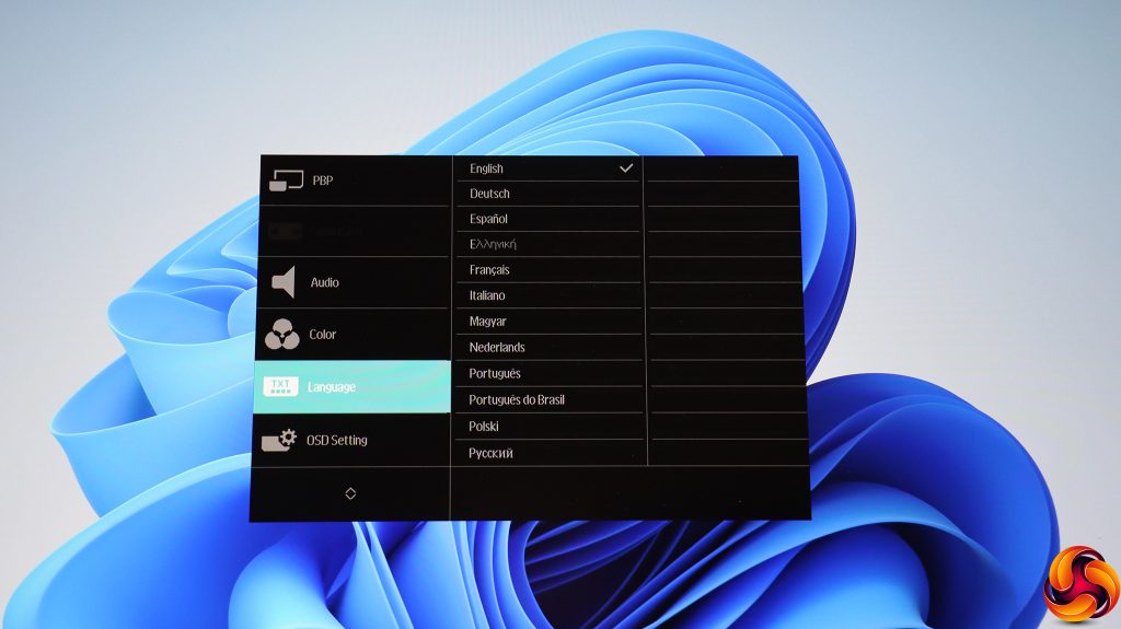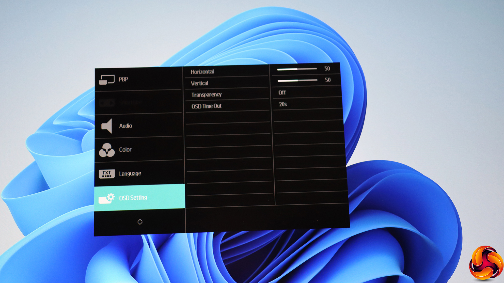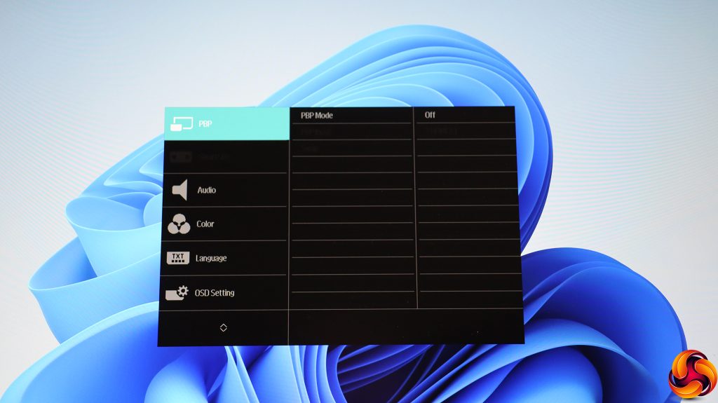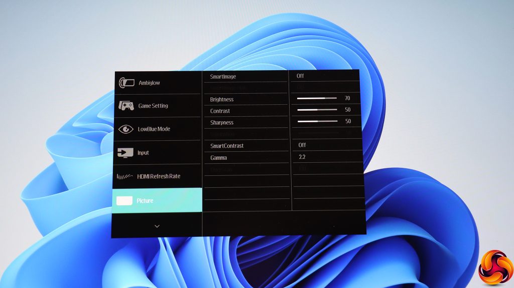 The Picture settings are buried quite far down in this menu. Here you can access the SmartImage presets, adjust brightness, contrast and sharpness, and turn on the dynamic SmartContrast system. You can also select Gamma modes from 1.8 to 2.6 in steps of 0.2. There are some greyed out options here too, barely visible in the image above. These are for adjusting SmartImage HDR, Saturation, and Overscan, but they rely on different input types and other options being enabled.