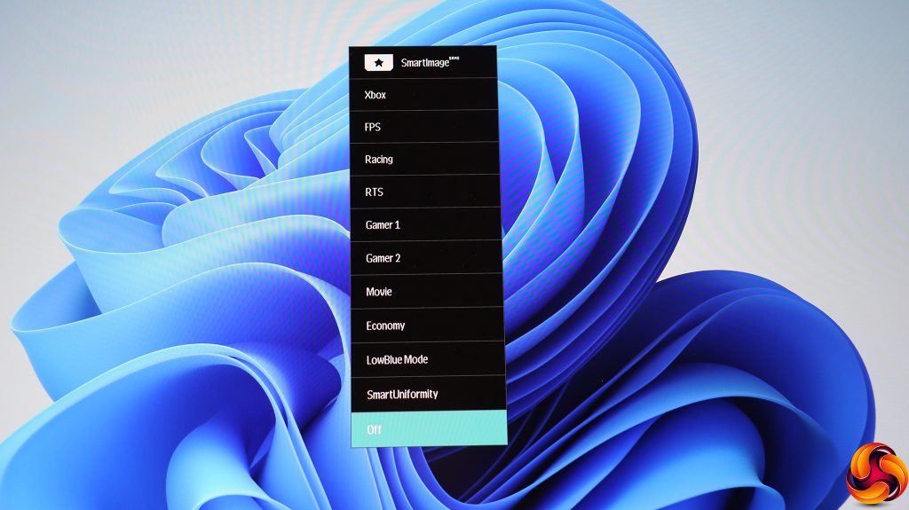 Push the joystick left and you get the Philips SmartImage presets, which include an extra over the regular set. This is an Xbox option. Otherwise, you get FPS, Racing and RTS gaming options, plus two Gamer positions you can store your own settings within. Then there are Movie, Economy, LowBlue Mode and SmartUniformity options, for more everyday activities. There is nothing specifically productivity oriented, however.