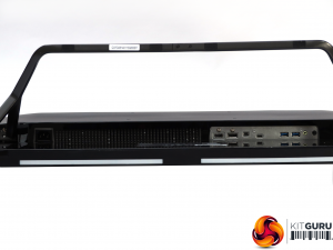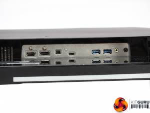 The standard kettle-lead power connection is on one end of the underside, with all the ports on the other. These include HDMI 2.0, followed by full-sized DisplayPort 1.2, then mini DisplayPort 1.2, and finally USB C. The latter supports both video input and upstream data, with the latter driving the two USB 3.0 ports further along.