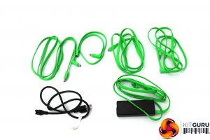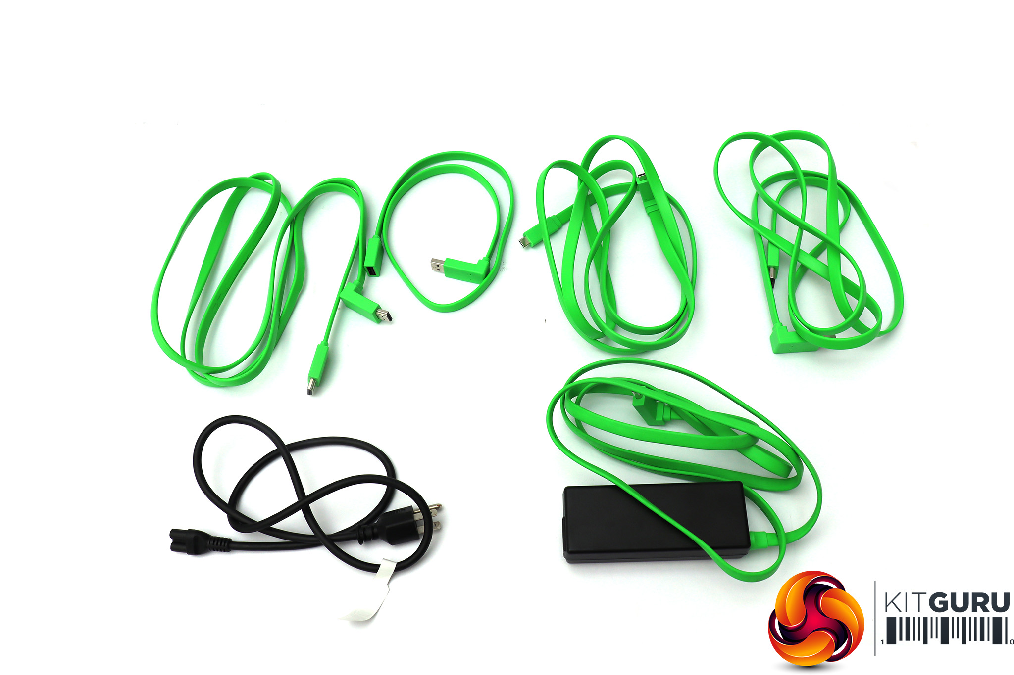 The Razer style starts straight away with the cabling bundle, which includes HDMI, DisplayPort and USB-C – all green ribbons rather than boring black rounded ones. Even the external power brick has a green ribbon attached, although the power lead is more normal in appearance. There's a green USB extension cable, too.
