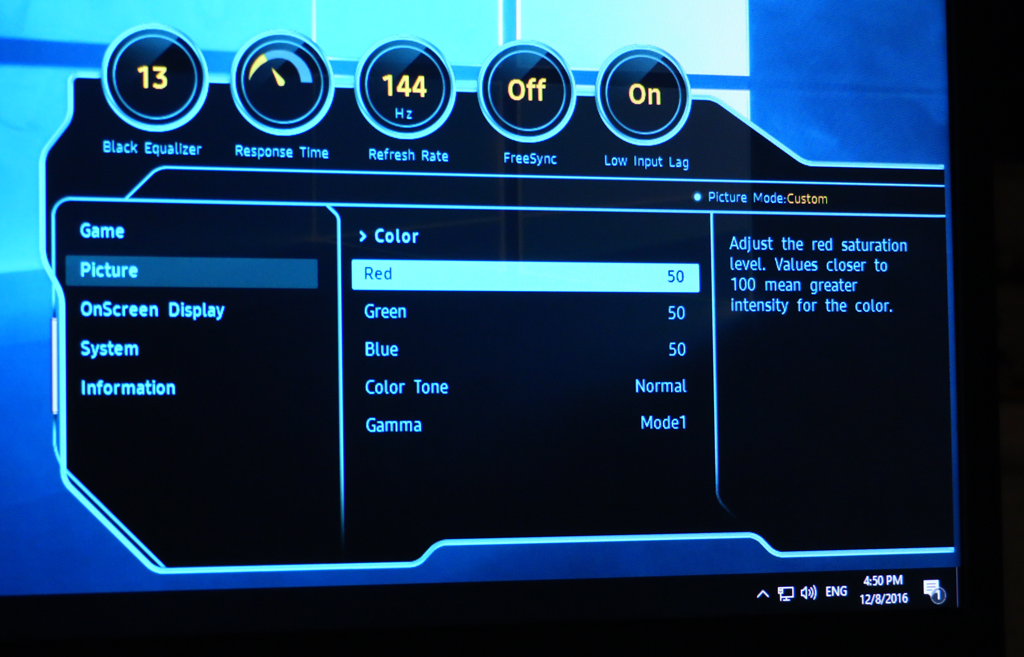 Both the Game and Picture submenus let you change the Picture Mode. There is a plethora of presets here for the main genres of game, including FPS, RTS, RPG and AOS (like DotA and LoL). There's also a High-Brightness option, sRGB and Cinema.