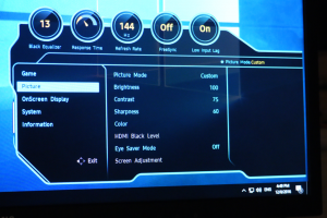 The full OSD provides five submenus – Game, Picture, OnScreen Display, System and Information. The Game menu lets you choose the Picture Mode presets, change the refresh rate from the default 144Hz, select the Black Equalizer setting, choose a Response Time of Normal, Faster, or Fastest, toggle FreeSync and Low Input Lag, or alter the aspect ratio of the frame. You can then save all these settings into one of the three preset slots that are activated by the buttons on the bottom of the bezel.