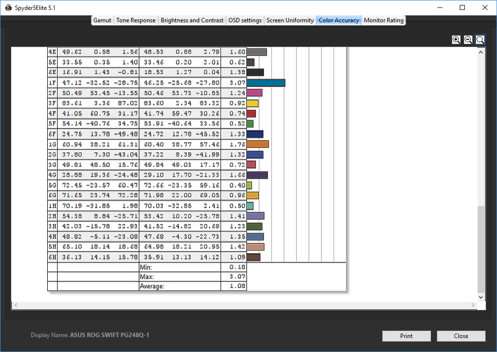 The factory calibration has clearly worked a treat, with an excellent 1.08. We have only seen a couple of results better than this, in particular the ASUS ROG SWIFT PG248Q (when calibrated), and Dell's UltraSharp 24 InfinityEdge U2417H was close too. But out of the box this is an amazing result.