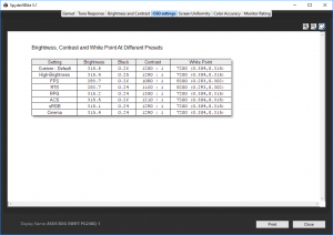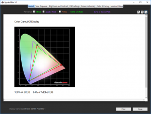 In the case of the Samsung, we performed the primary testing at the native 1,920 x 1,080 resolution in the default Custom preset mode. We also left the monitor at 60Hz (which is not the default – this is 144Hz) because higher refresh rates can affect colour performance. Our test system was equipped with an NVIDIA Quadro K2200. Note that the screenshots below have the wrong Display Name at the bottom. They were not the results of the ASUS ROG SWIFT PG248Q, but for some reason the Spyder system insisted on keeping that monitor name from a previous test.
