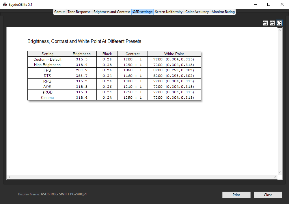 - A monitor’s contrast ratio at various brightness levels in the OSD.