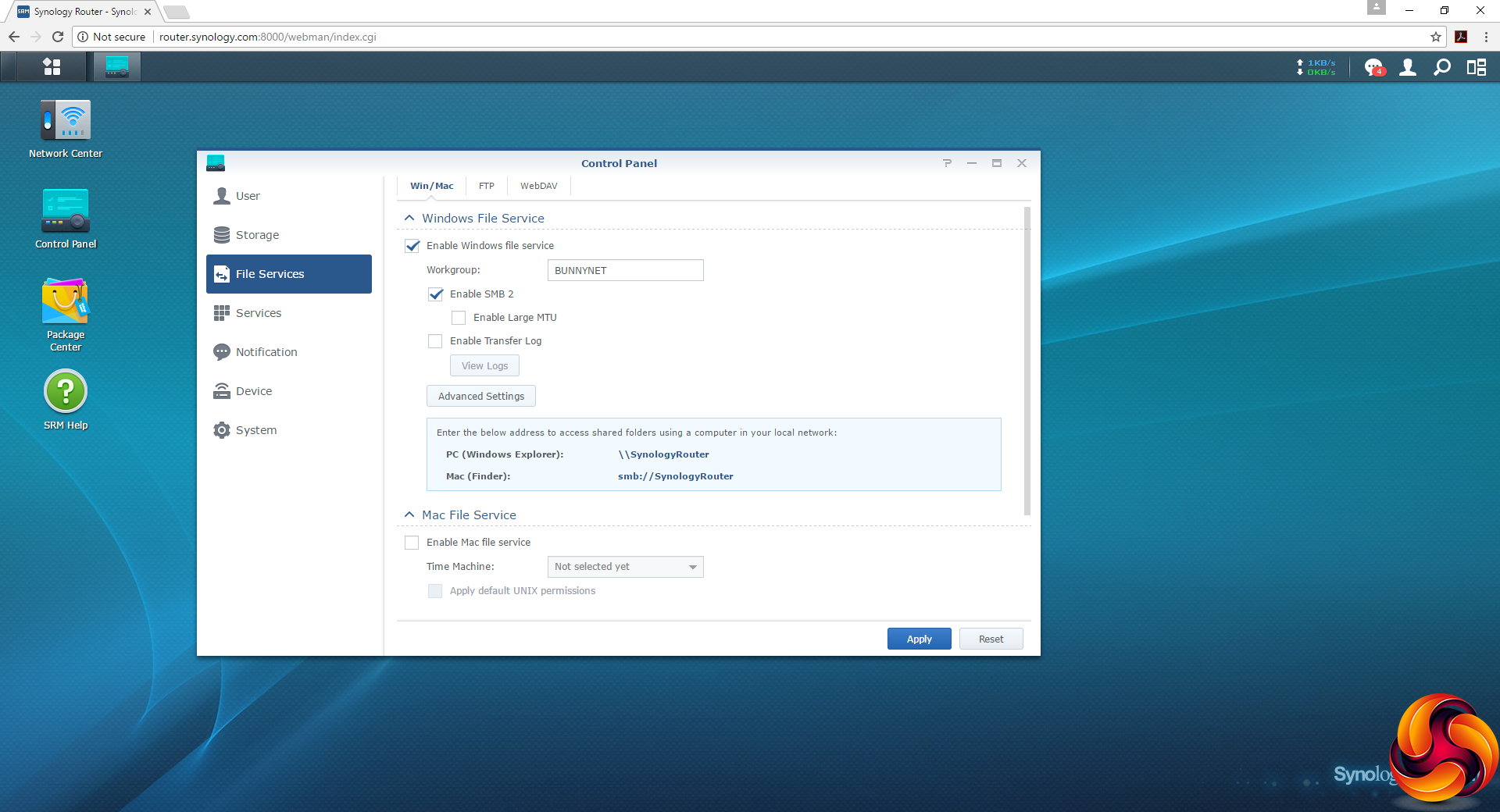 Turning to the Control Panel, the File Services section is where you configure how the storage devices you plug in via USB or SD card behave, and how they can be accessed over the network. However, we found that a USB drive is automatically configured and shared via the admin password.